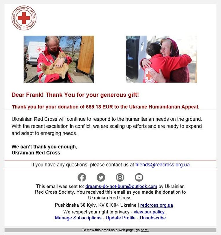 Genau 659,18€ gingen direkt an die Hauptverwaltung des Ukrainischen Roten Kreuzes, die diese Spende als wichtige Unterstützung ihrer alltäglichen Einsätze im Kriegsgebiet honoriert und durch eine offizielle Spendenbescheinigung ihrerseits bestätigten.