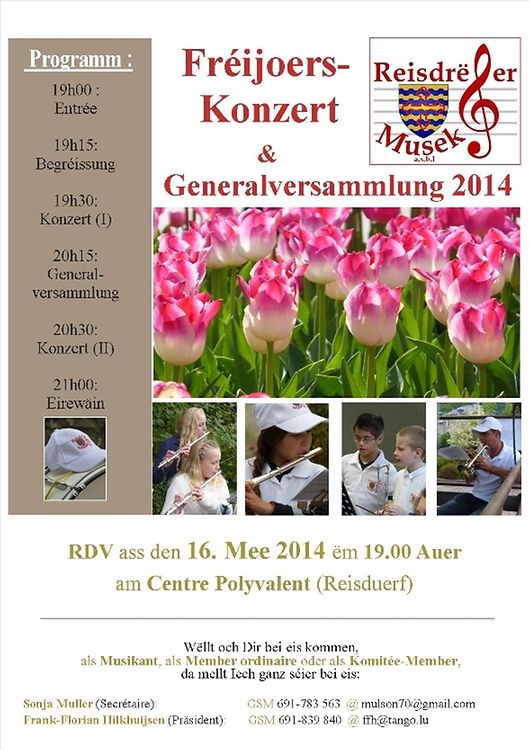 D' Reisdrëfer Musek a.s.b.l. invitéiert Iech alleguerten op eis 1. Freijoers-Konzert mat uschléissender Generalversammlung den 16.Mee 2014 an den Centre Polyvalent zu Reisduerf, Entrée ass ëm 19 Auer.
