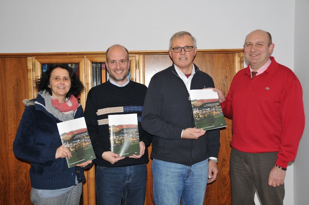 Anlässlich der Fertigstellung der 1. Ausgabe des neuen „DE REDDER“ überreichten die Redaktionsmitglieder Marianne Aumasson, Frank Hilkhuijsen, Paul Mathias dem Reisdorfer Bürgermeister Fränk Weber das erste Exemplar, der dieses mit großer Vorfreude seinerseits entgegennahm und sich für eine zügige Verteilung der neuen Gemeindezeitung à tous les ménages einsetzen wird.