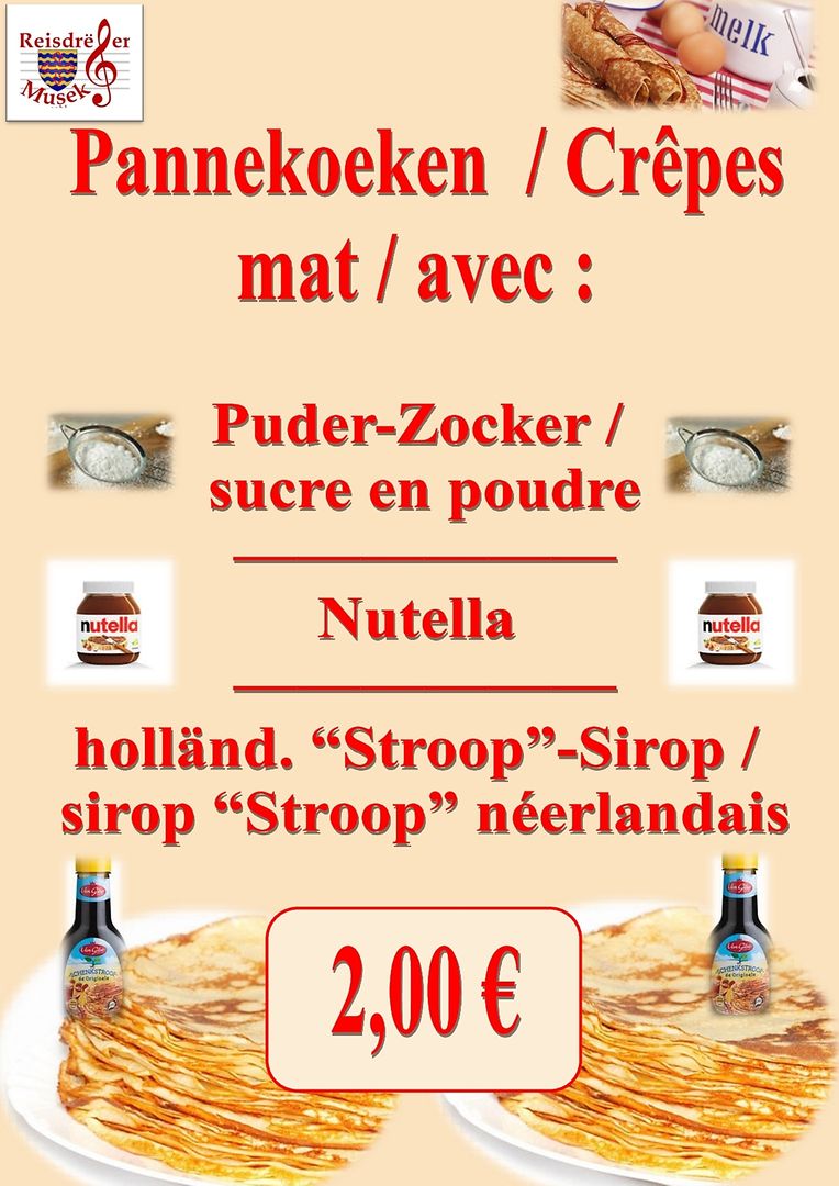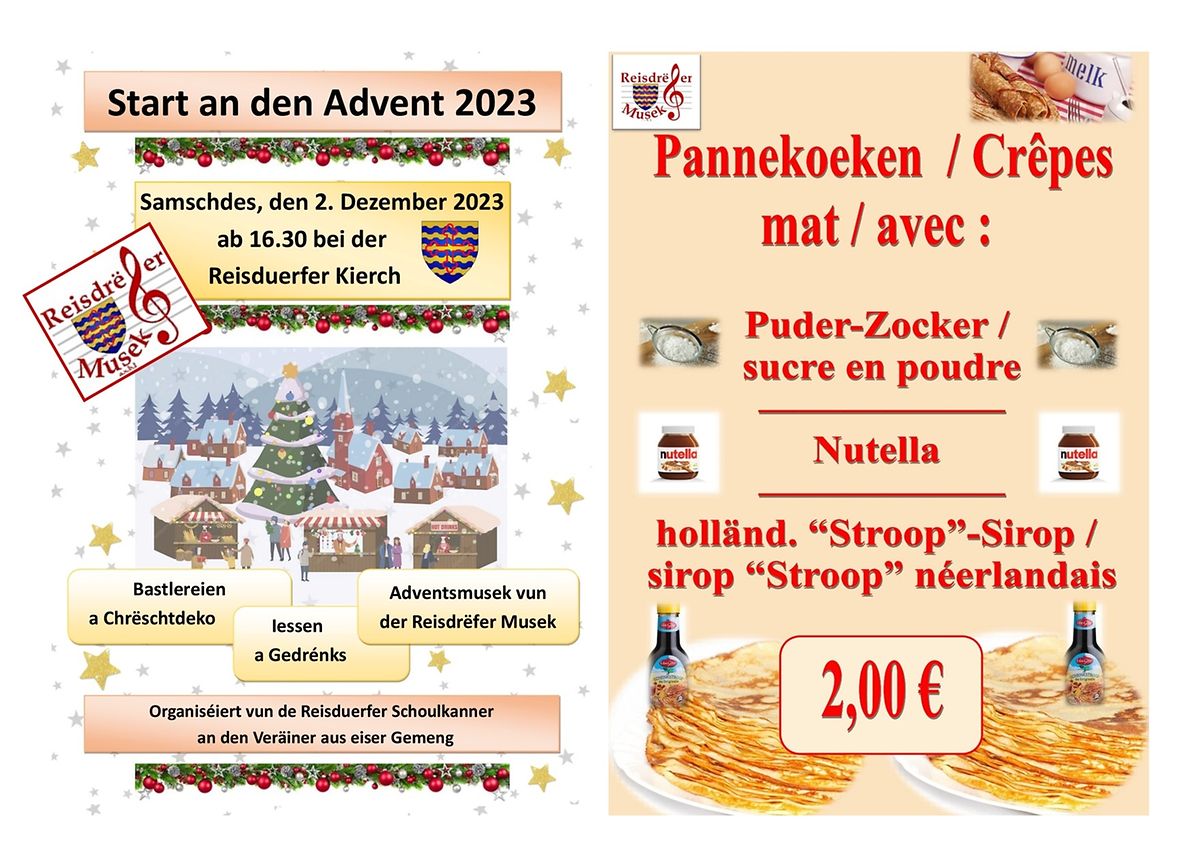D'Reisdrëfer Musek offréiert nees ganz flott Adventsmusek an hier authentësch hollänesch Pannekoeken beim "Start an den Advent 2023" den 02.12.2023 bei der Reisduerfer Kierch - an Dir sidd alleguerten ganz häerzlëch invitéiert eisen Musikante nozelauschteren an dobäi e puer vun eisen besonnesch leckeren Pannekoeken schmaachen ze kommen.