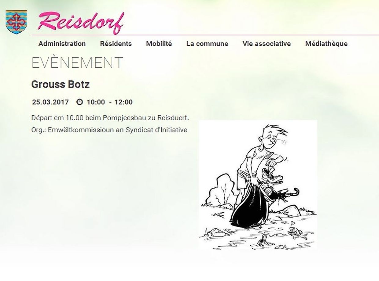 Beim alljährlichen GROUSS BOTZ in Reisdorf, der von der Umweltkommission und dem Reisdorfer Syndicat d’initiative zusammen am 25. März 2017 organsiert wurde, kam nicht nur jede Menge unerwünschter Müll zusammen, sondern auch ein besonders grosses Aufgebot von freiwilligen Helfern aus nahezu allen Reisdorfer Vereinen, die es sich zur Ehre machten, der Gemeinde und der naheliegenden Umgebung einen sauberen Eindruck zu geben.
