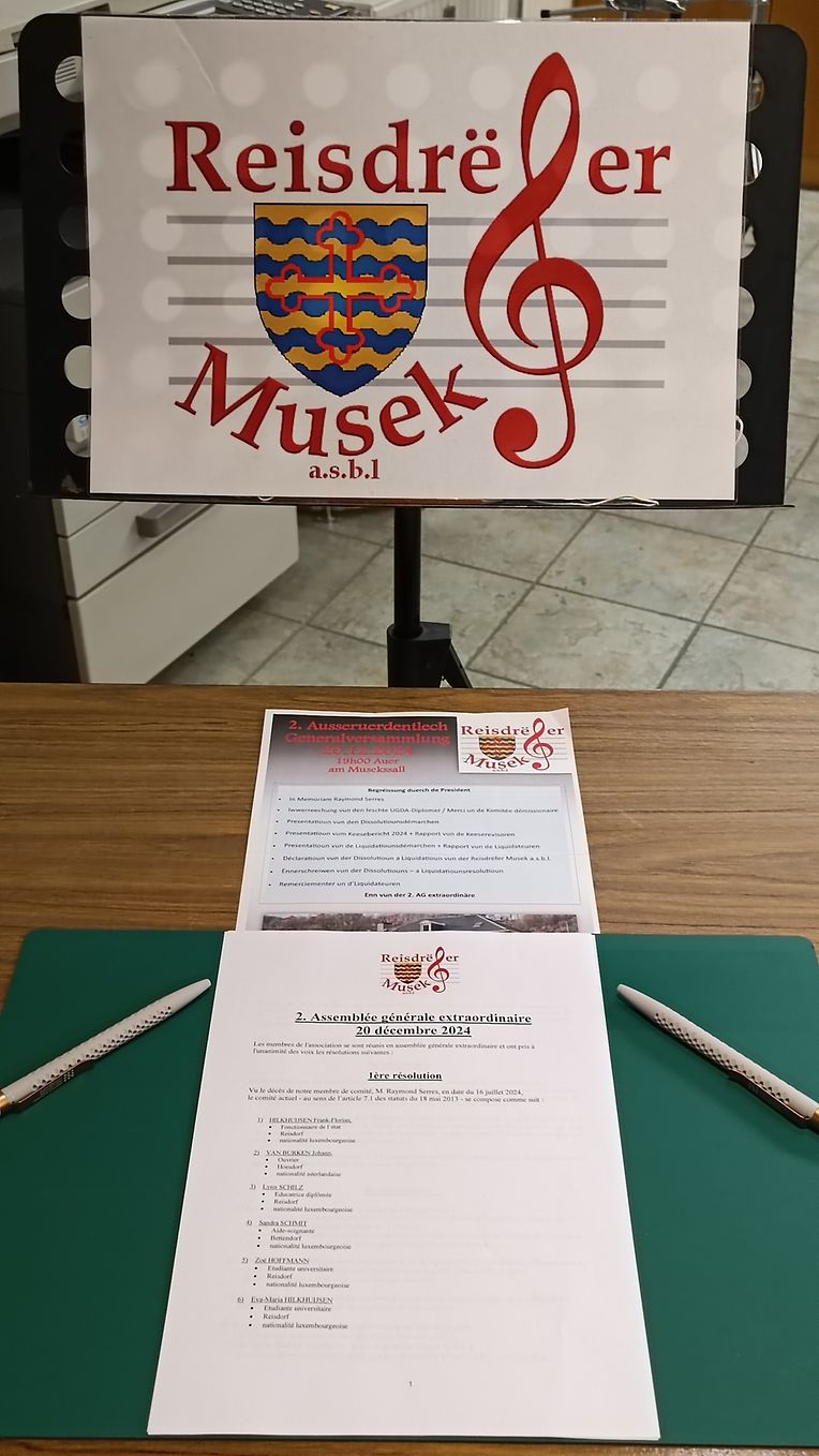 Am 20.12.2024 fand die 2. Außerordentliche Generalversammlung der „Reisdrëfer Musek a.s.b.l.“ statt, die die Liquidation und Dissolution des 11 Jahre alt gewordenen Musikvereins aus Reisdorf besiegelte.