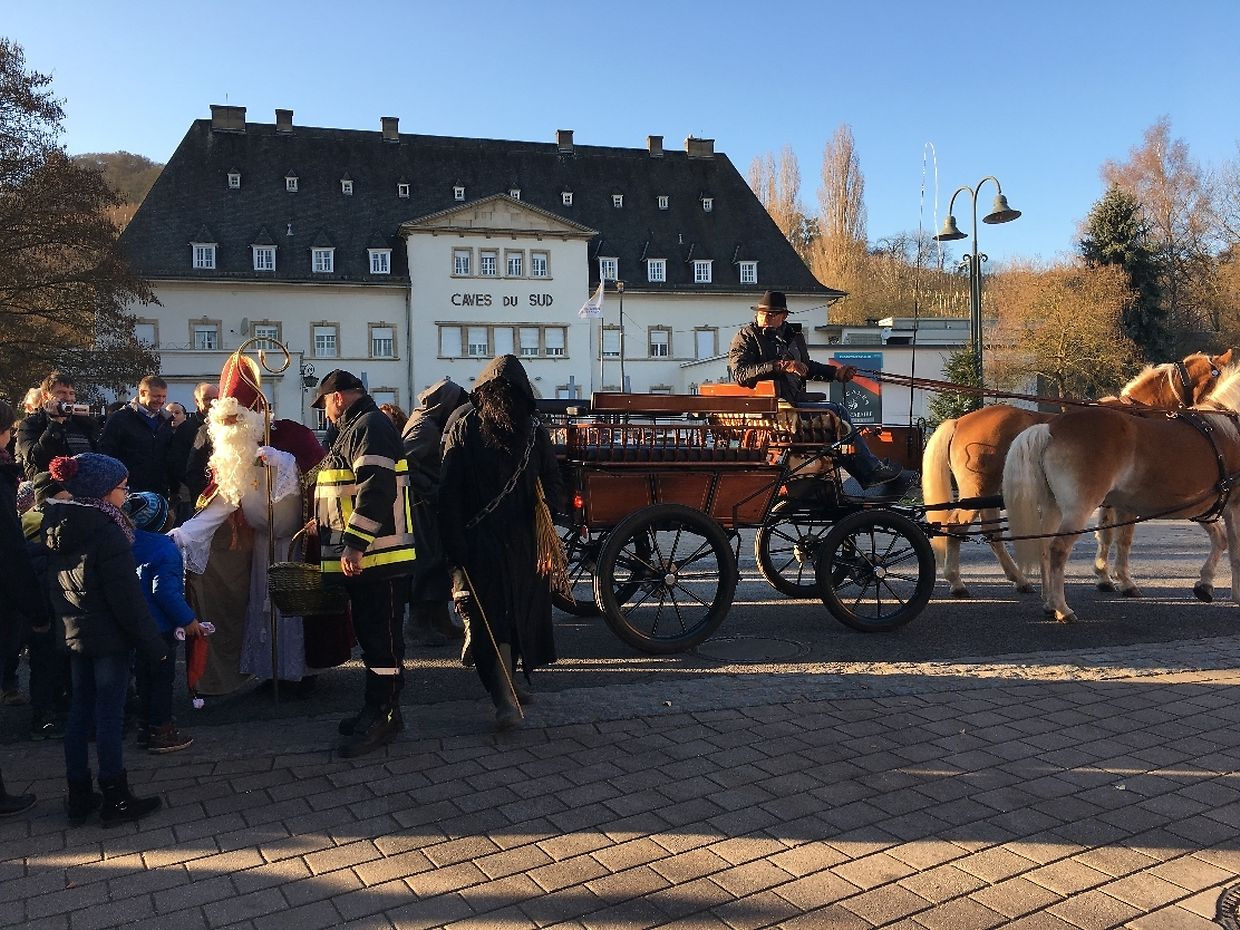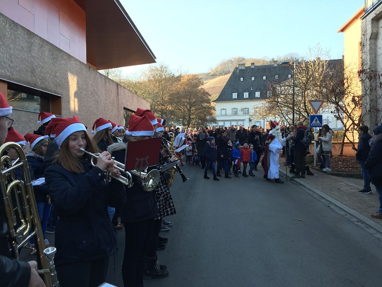 E Sonndeg de Metteg war d'Opreegung grouss fir die Kleng aus der Zentralschoul vu Remerschen. De Kleeschen a säin schwaarze gesell waren op Besuch an hunn dene braven Kanner Schokela an e Boxmännchen verdeelt. Duerno huet de Kleeschen nach an flotten Chrëschtbazar vun der Schoul eran gekuckt an all die flott Sachen bewonnert déi Kanner aus denen verschiddenen Cycle'ën gebastelt hunn. E Stéck Kuck mat enger Taass Kaffi gouf et um Bazar a dobaussen huet de Fëscherveräin vu Remerschen e gouden Glühwäin zervéiert. Begleed war de Cortège musekalesch vun der Schengener Musek.