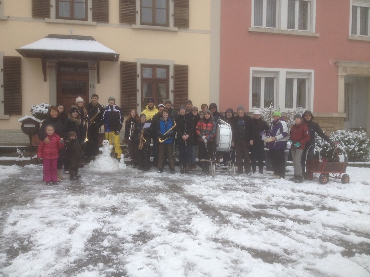 Zu Remerschen woar rëm Kiermes. Wat dann op kengem Fall feelen dierf, ass den Hämmelsmarsch vun der Schenger Musek. Dëst Joer allerdéngs, war d’Wieder eng Herausfuederung fir d’Musikanten, déi sech mat der Keelt an dem Schnéi misse rëmschloen. Der gudder Laun huet dat allerdéngs net geschuet an sou gouf et rëm e flotten Hämmelsmarsch.