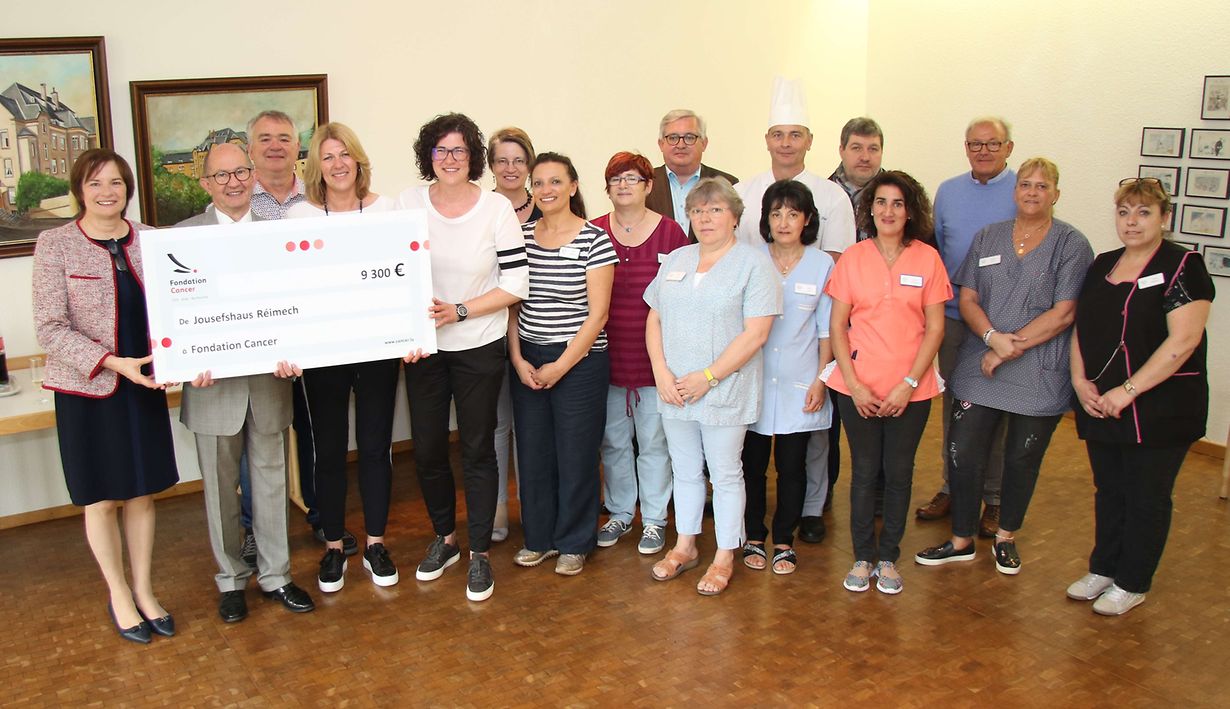 Réimech: Mat grousser Freed hun d'Frënn vum Réimecher Jousefshaus dëser  Deeg e Scheck vun 9.300 Euro un "d'Fondation Cancer" iwwerreecht. Schon zanter 12 Joer maachen si och beim "Relais pour la Vie" mat. Dëst Joer hunn si fir zweet e "Charity-Owend" am Restaurant Christian Kohn zu Altwies organiséiert, an um Réimecher Chrëschtmoart get och ëmmer Geld gesammelt fir ze spenden . Jean Becker via mywort.lu