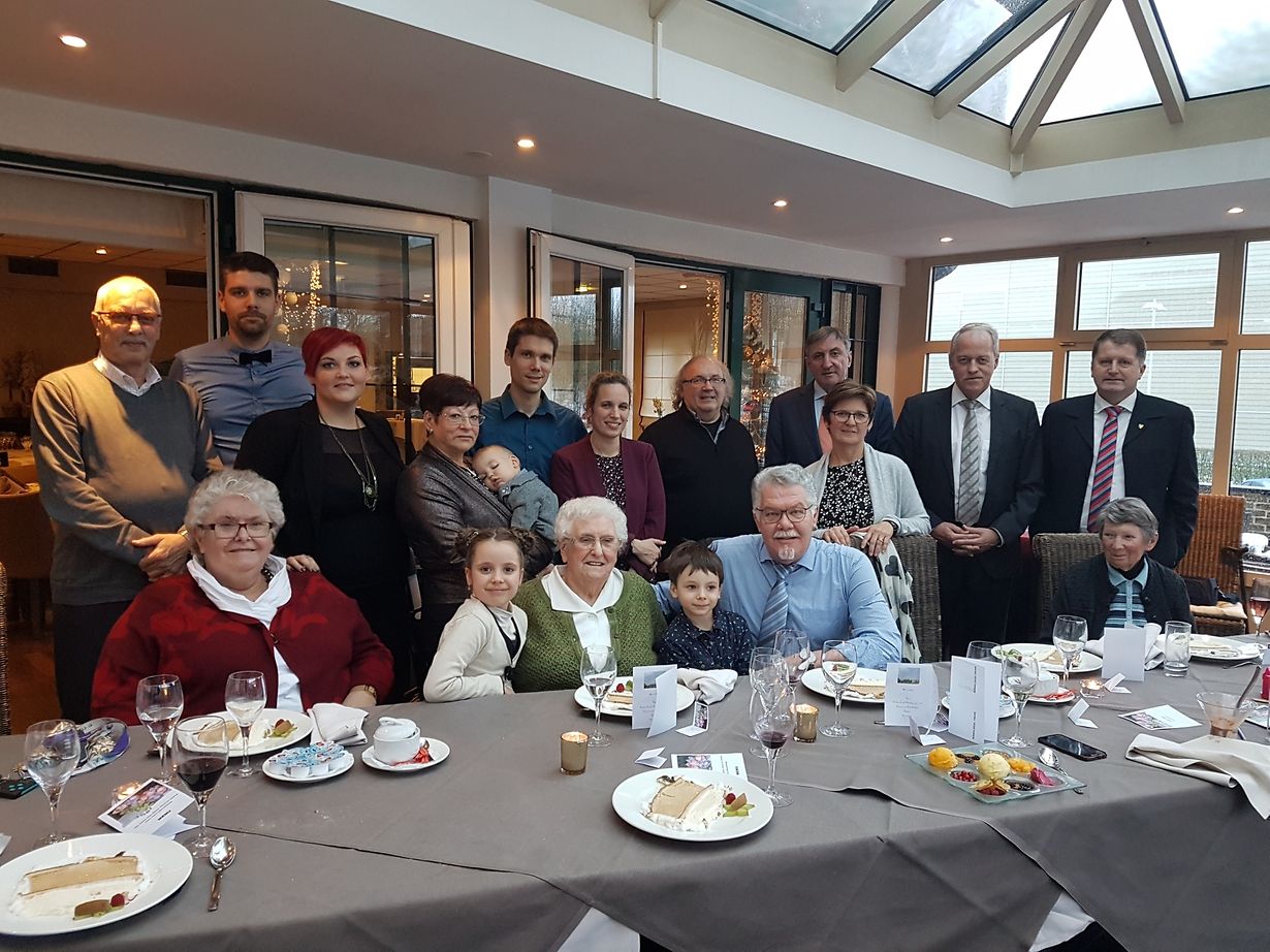 den 9 Dezember kruut d' Madame Anny Mander- Jagusch vu Rodange hier 90 Jôër. Si huet Sonndes zesumme mat hierer Famille am Hôtel Threeland gefeiert. De Buergermeeschter mat de Scheffen hun hier och gratuléiert mat enger schéiner Corbeille. Si ass leider scho Witfrâ zënter 1998. Si huet eng Duechter, ass Boma vun 2 Jongen a stolz Urboma vu bis elo 1 Meedchen an 2 Bouwen. Si ass nach bei gudder Gesondheet, just hiere Réck an hier Been wëllen net méi sou richteg. Mier wënschen hier alles Guddes an dass se nach vill Jôre bei eis ass.