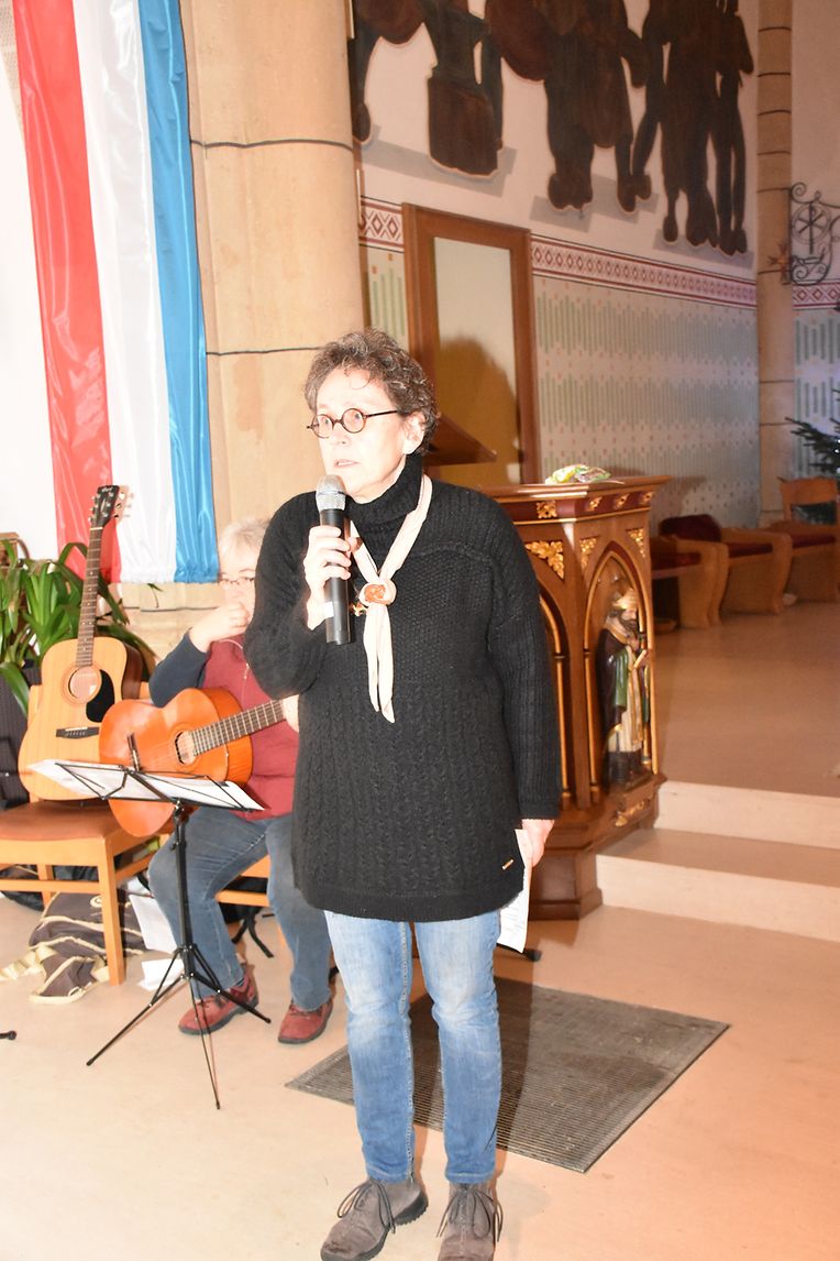 Um 17Auer 30 ass et dun an der Rodanger Kiirch weider gaang, wou eng Veillée stattfonnt huet, wou jiddereen Häerzlech Wellkomm wuar. Des Veillée ass vum Michèle Hilger an vum Här Paschtouer Romain Richer geleed gin. Musikalesch gouf se vun engem Gitarrsgrupp vun de Rodanger Guiden a Scouten verscheinert. Och en Organist huet do gehollef mat sengem Keyboard. Während der Veillée hun Biber am Wëllef en afrikaneschen Danz presenteiert, AvEx hun e puer Saachen erzielt waat si ennert Fridden verstin. CaraPio hun erzielt, wéi een iwert Nolauschteren zum Fridden kann bäidroen, en aner CaraPio Grupp huet erzielt wéi een de Fridden mat den Hänn kann verbreeden respektiv wéi een mat den Hänn zum Fridden kann bäidroen.