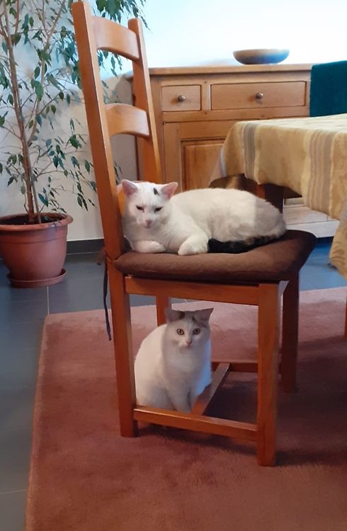 Salut, ech heeschen Gaston a mäi Brudder ass den Raymond. Mir siichen zesummen e neit Doheem. Den Raymond ass méi schei wéi ech a geet dofir net eraus. Mee ech brauch schonn meng Trëppeltier dobaussen. Mir verdroen ons mat feinen Katzen a siichen en rouhegt Doheem. Mir sinn 6 Joer jonk, kastréiert, ge'impft a gechipt. Wann dir ons känneléiere wëllt, kontaktéiert Amiavy ënnert der N.: 621743773, merci äre Gast & Raym