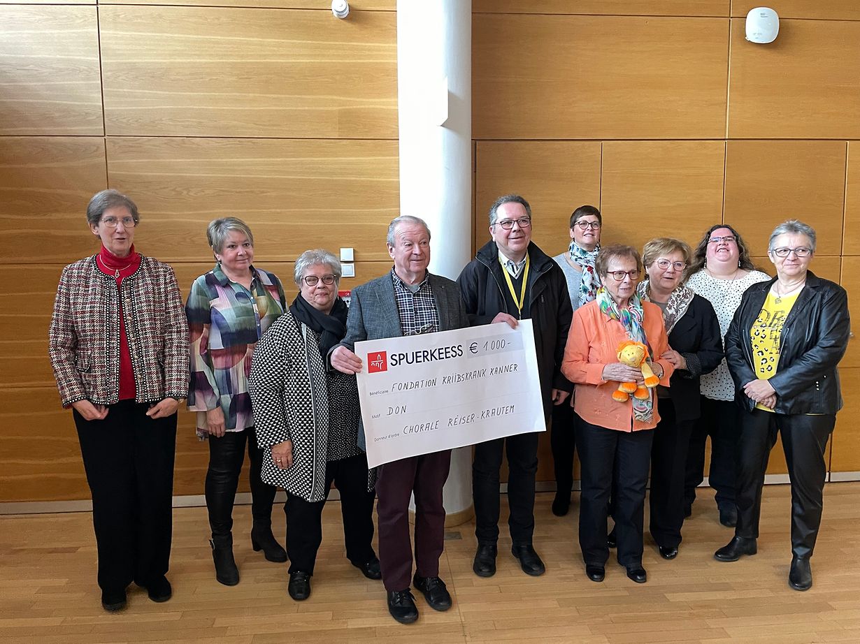 Bei Geleeënheet vun der dësjäreger Generalversammlung vun der Chorale Ste Cécile Réiser-Krautem gouf e Scheck vun 1.000 € un d’Fondatioun Kriibskrank Kanner iwwerreecht. Dës Zomm koum duerch d’Quête beim Concert „Sangen ouni Grenzen“ vum leschte Joer zesummen.