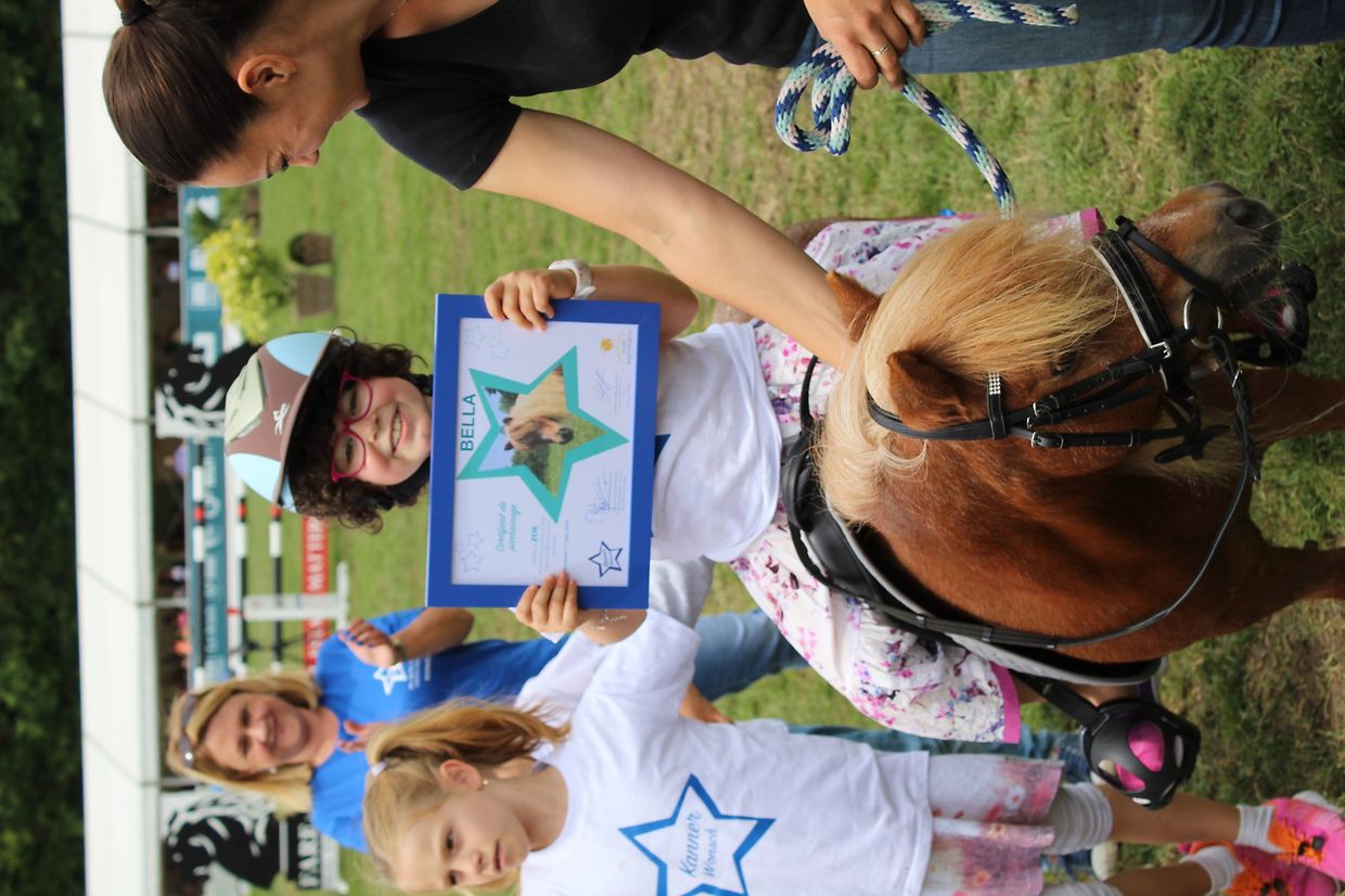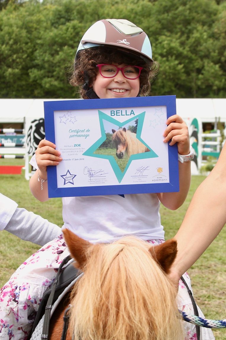 Maintenant, il ne restait plus qu'à rencontrer ... Bella! Paré de rubans bleus, le charmant poney a fait la connaissance de Zoé, submergée de bonheur à la rencontre de sa nouvelle amie. En tant que nouvelle marraine de Bella, Zoé peut lui rendre visite aux Ecuries Hoffmann, la monter à loisir et prendre soin d'elle quand elle le désire. Zoé ne peut attendre pour emmener sa nouvelle amie à travers les forêts et grandir avec un poney à ses côtés. Grâce aux organisateurs de l'évènements, qui ont offert une panoplie complète à Zoé, elle pourra aisément emmener Bella en promenade dès demain si le coeur lui en dit!