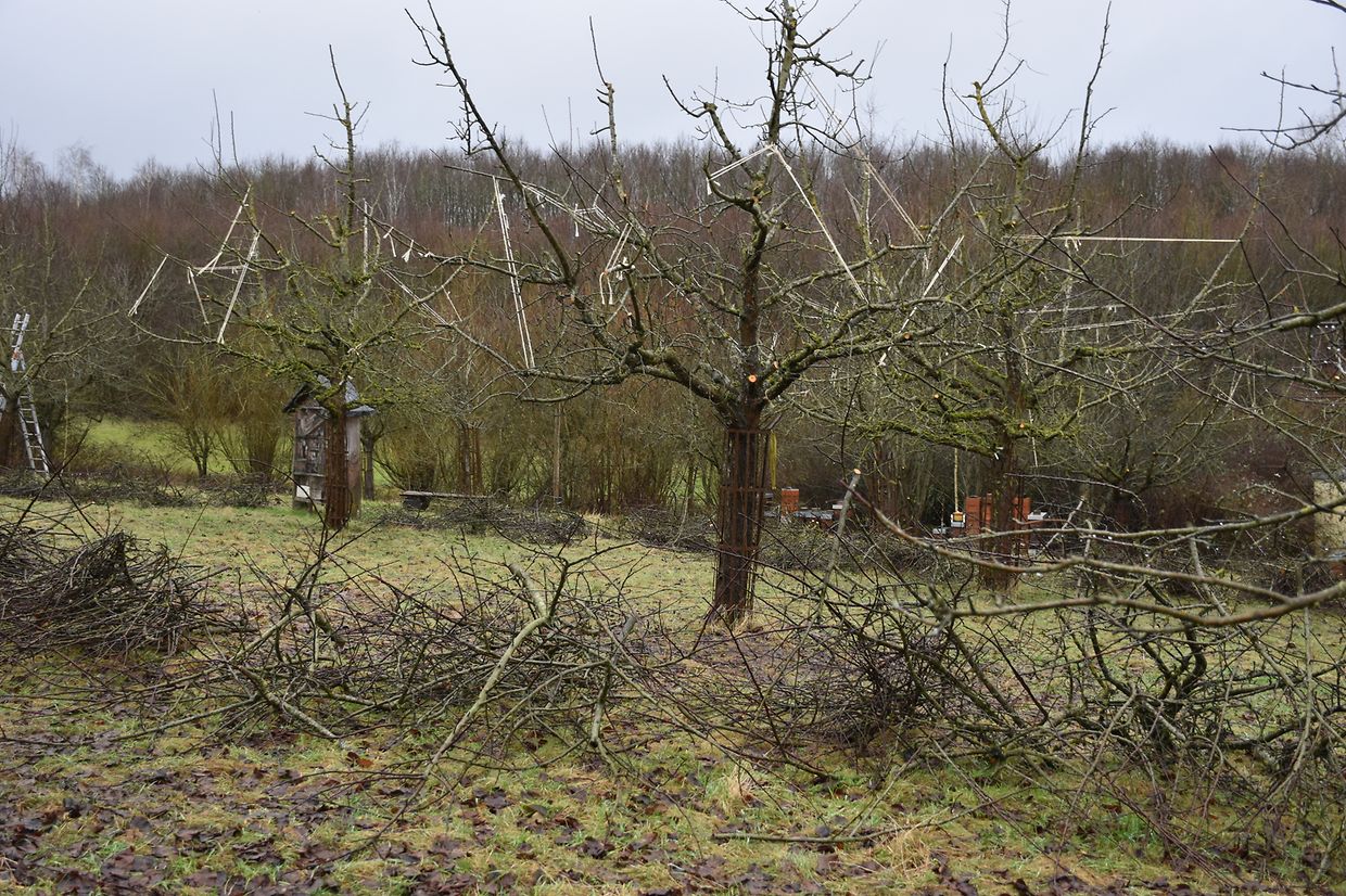 Mit den Gemeindevertretern haben wir die Streuobstwiese Rauenaker in Roeser besichtigt. Hier stehen etwa 80 Obstbäume unterschiedlichen Alters, die im Rahmen von Schutzmaßnahmen zum Erhalt von Streuobstwiesen gepflanzt wurden. Es handelt sich vor allem um heimische Apfelsorten, wie Boskoop oder Triumph, und Pflaumen.