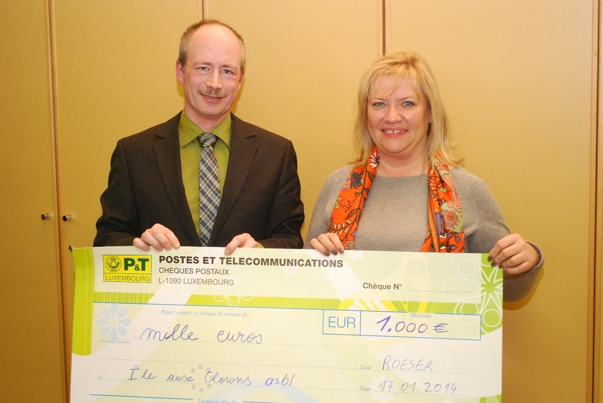 E Freideg 17.Januar huet d'Réiserbänner Musek no hirer alljährlecher Generalversammlung e Scheck iwwer 1000€ un d'Associatioun "Ile aux clowns asbl."iwwerrreecht.Dës Somm war den Erléis aus der Quête vum Wantergala , deen d'Musek den 15.Dezember gespillt huet. D'Madam Drees Joëlle, Responsabel vun der Associatioun Ile aux clowns, huet en interessanten Abléck an d'Aarbecht vun hiren Mataarbechter ginn an d'Leit iwwerzeecht, datt dës Somm gutt investéiert ass.