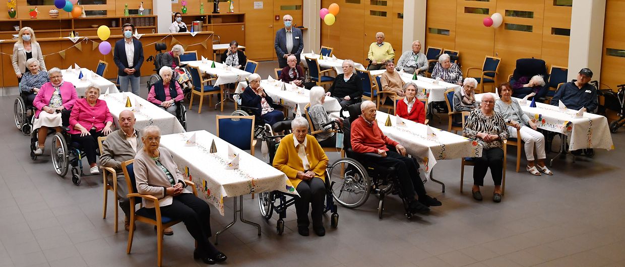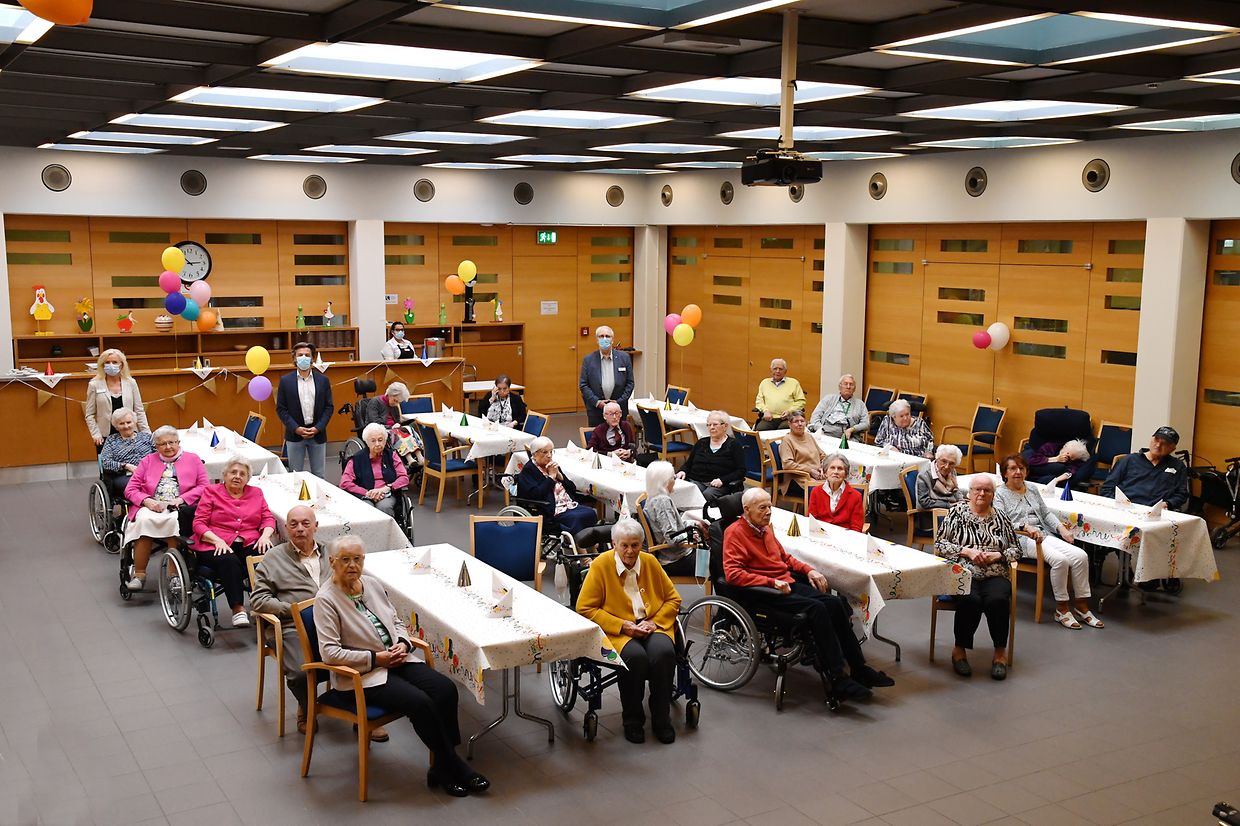 Rolleng/Miersch: Fir dest Joer war et Ënn Abrëll di éischt gemeinsam Geburtsdagsfeier fir Matbewunner a Leit aus der Résidence vum CIPA- Blannenheem. Am festlich mat Loftballons gerëschtem Saal a schéi gedeckten Dëscher huet den Generaldirekter Christian Erang zesummen mam Generaldirekter- adjoint Thierry Lutgen an hirem Team allen 41 Gebuertsdagskanner vun de Méint Mäerz an Abrël am Numm vum Haus bei deser Feier haerzlich gratuléiert. Eng Première am Blannenheem war och den Optrëtt vun der hauseegener Chorale „DO- RE - MY“ mam Organist Jean Mootz, déi mat bekannte Lidder deser Gebuertstagsfeier fir richtig Stëmmung am Saal gesuergt huet. Bei engem gudde Glas Crémant mat engem Stéck Kuch a Kaffi ass a gudder Atmosphär zesumme gefeiert gin. D’Geburtsdagskanner waren: Gertrude Engeldinger-Muhlen, Victorine Philipp- Wagner (98 Joer); Henrika Delahaye-Kikken, Alice Schaack- Kugener, Marguerite Rinnen-Jaeger (91); Katharina Reckenwald- Bastuck, Diane Bintz-De Vleeschauwer, Gabrielle Mortelmans-Wiltgen, Albert Einsweiler, Marthe Flammang (90); Irmina Schwachten- Betz, Lucien Hess, Michel bourmerCécile Conrardy- Reding, Marguerite Magerotte- Neser (89); Marie- Josée Bofferding-Lommel, Aloyse Theisen (88), Catherine Hilger- Krack, Joséphine Steffen-Schweyen,Anne Dostert-Schlim, Elisabeth Felten- Goller (87); Joseph Zenner, Eugène Lambert, Josette Reiser-Palm, Joseph Kass, Jos Wahl, Félix Damgé (86); Berta Vosmann-Va Vilsteren (85); Justine Hess- Frauenberg, Jos Beck, Albertine Martin (83); Liette Beck- Majerus (81); Georgine Thoma- Schwinnen (77); Marianne Klosen (76); Nicole Dubost- Fouchet (75); Germaine Kerger- Schiltz, Jeanny Even- Schmitz (73); Marie- Rose Knubben (65); Marie Virginie Seil (63); Liette Calteux (61); Patrick Hurst (40). (CR) (FOTO: CHARLES REISER