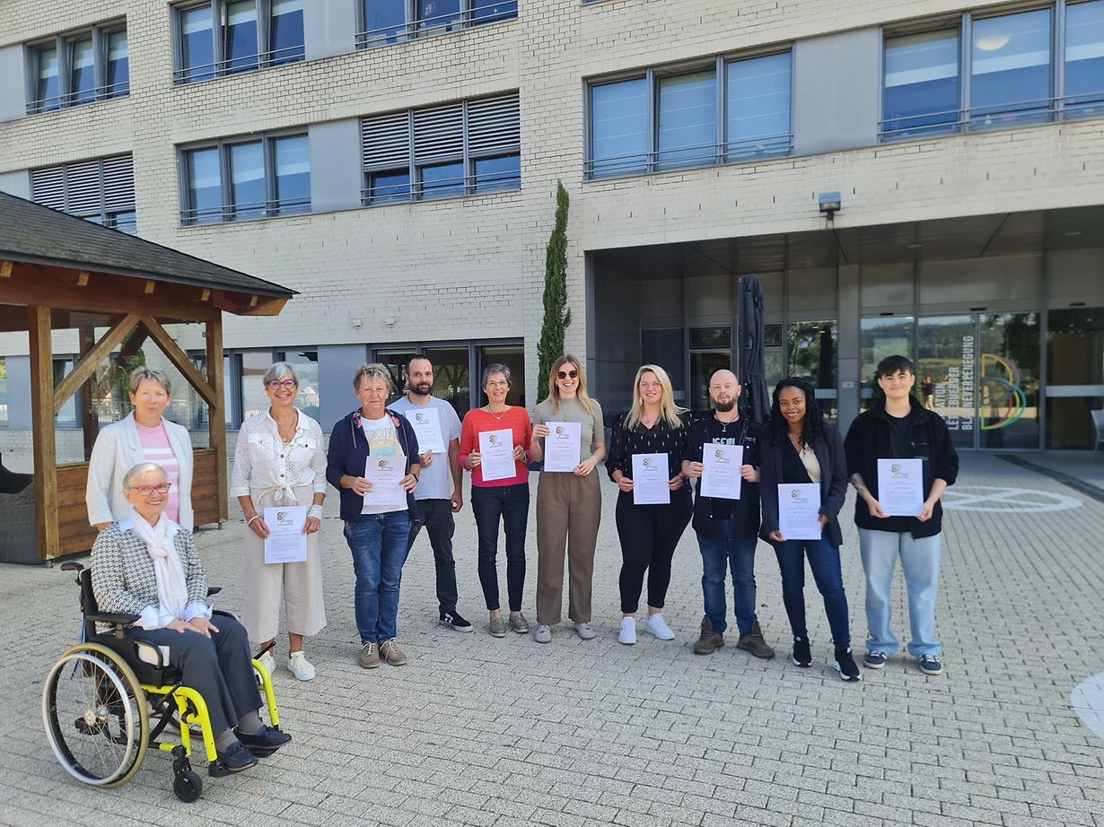 Den 20. September 2024 huet de Lëtzebuerger Veräin fir Gediechtnistraining asbl (LVGT) un 9 nei “Ganzheetlech Gediechtnistrainer*innen” de Zertifikat iwwerreecht. Wärend dräi Woche goufen Dammen an d’Hären vun der Ausbildungsreferentin, der Madame Regina Marquardt (steet lénks am Bild), vum BVGT (Deutscher Bundesverband für Ganzheitliches Gedächtnistraining e.V.) ausgebilt.