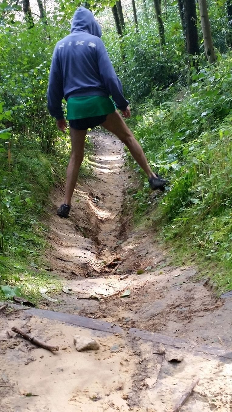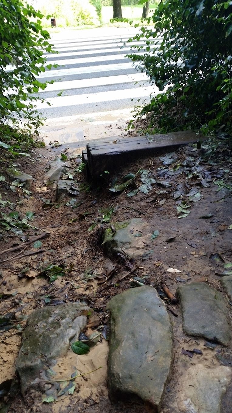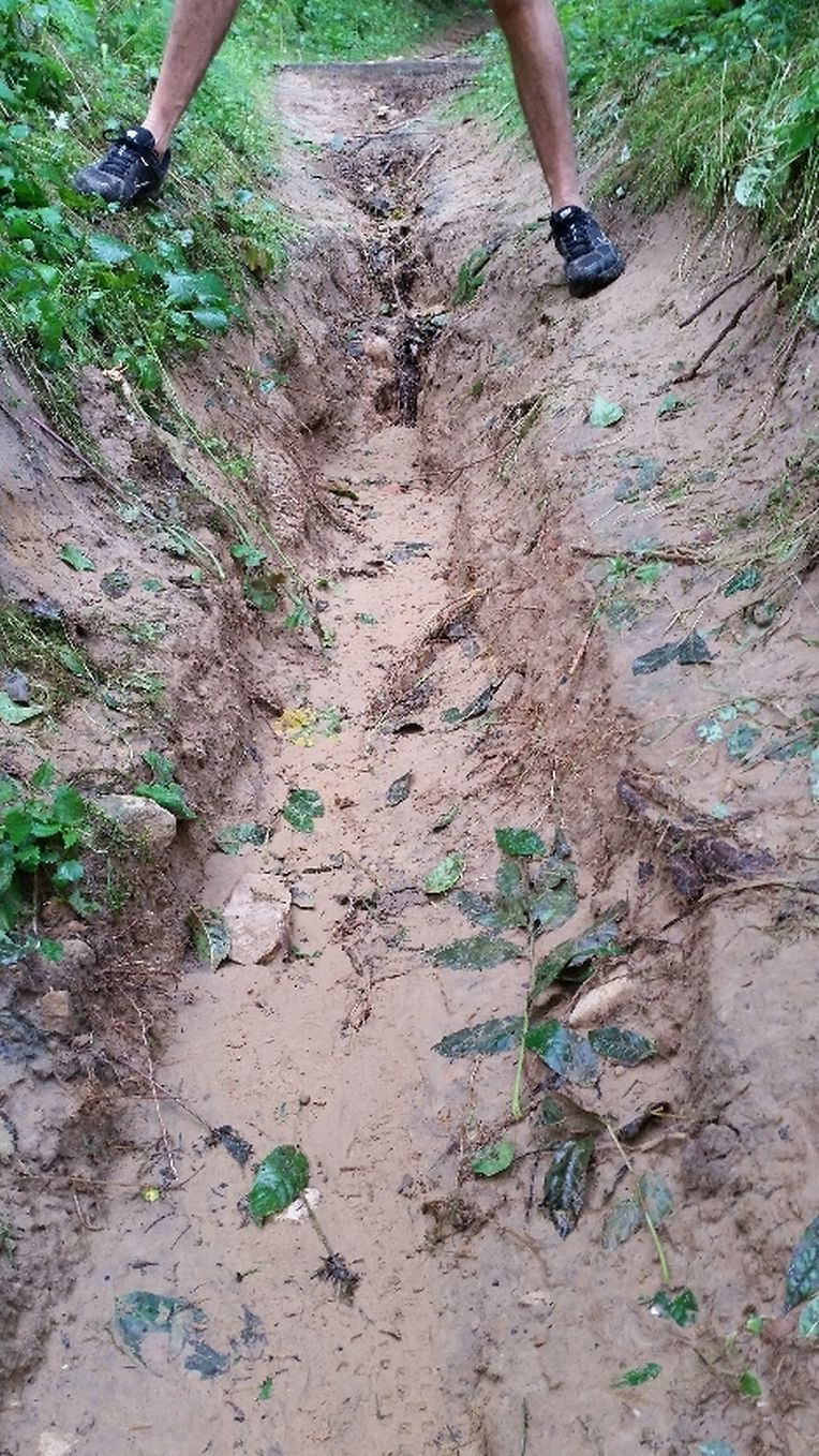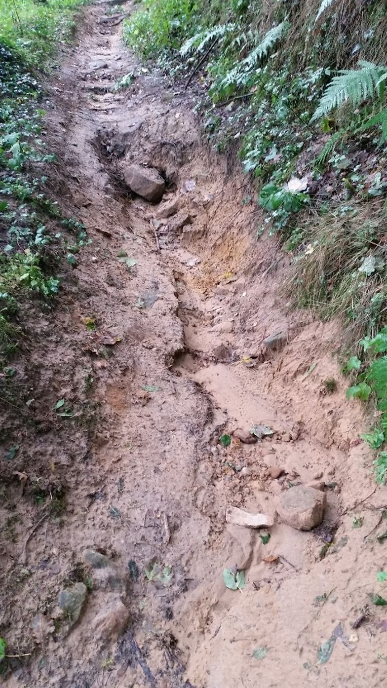 Am Bambesch huet de Reen vill Schued gemaacht. Dat ass am Verglach zu anere Problemer uechter d'Welt natiirlech kaum derwäert dovun ze schwätzen. Ma fir déi puer Leit déi do spazéieren oder jogge ginn ass et guer net kamoud fir z.B. vun de Siwebueren op d'Reckendaller Kopp ze goen. An d'Léisung hei ass einfach: Op all 10 Meter soll e klenge Gruew sinn fir d'Waasser säitlech aus dem Wee ze huelen. An déi Griew, déi et deels scho gëtt, missten dann awer och regelméisseg gebotzt ginn.