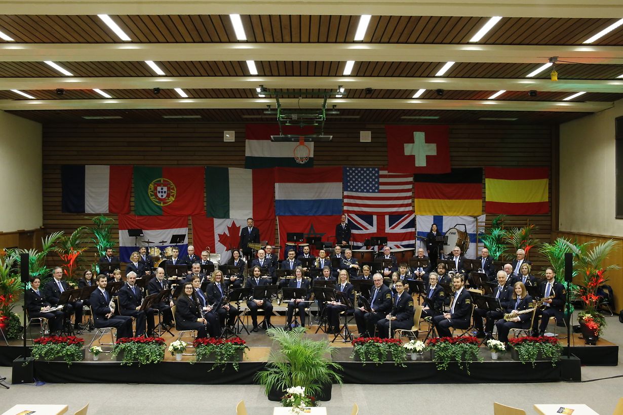 De 4. Dezember war et endlech souwäit : a méi engem klenge Kader wéi gewinnt, awer top motivéiert hunn d’Musikanten aus dem Rollengergronn hiren éischte Concert op grousser Bühn zanter zwee Joer gespillt. D’Dekoratioun hannert der Bühn huet symboliséiert, op wat d’Musek besonnesch houfreg ass : net manner wéi 14 Nationalitéite sinn an der Musek vertrueden a sou ass et zur Normalitéit ginn, dass an de Prouwen tëscht op d’Mannst zwou, awer och dacks nach méi Sproochen hin- an hir jongléiert gëtt, eng Erausfuerderung, déi de sproochentalentéierten Dirigent Ivan Boumans awer immens gären unhëlt.