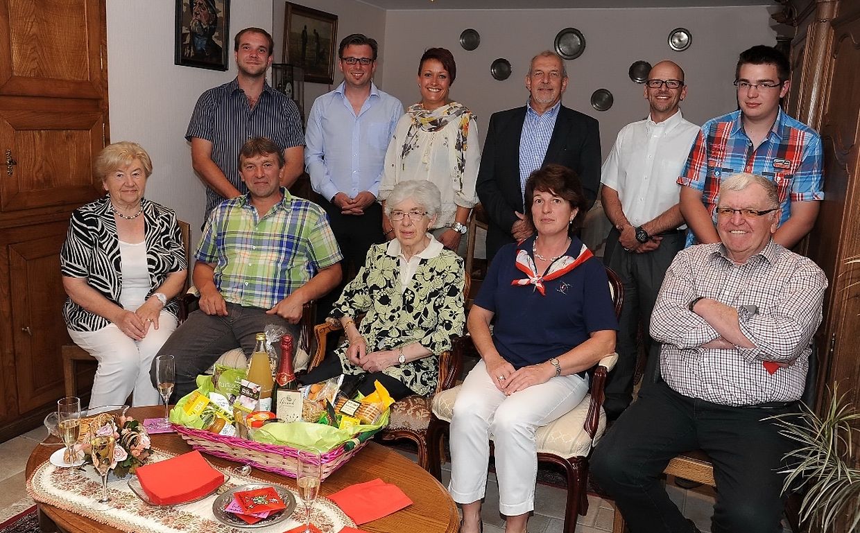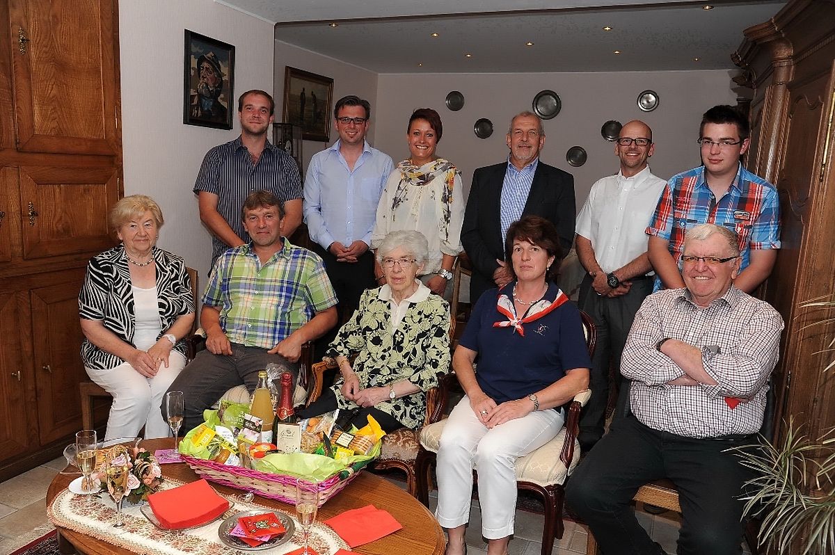 Neulich konnte Elise Crochet- Steichen aus Roodt/ Redingen auf 85 arbeitsreiche Jahre zurückblicken. Die Jubilarin erblickte das Licht der Welt am 21. Juni 1929 in Roodt als jüngste Tochter von vier Kindern des Ehepaares Jos Steichen und Anna Redlinger. Am 18. Oktober 1954 führte Landwirt Norbert Crochet aus Roodt, seine Gattin Elise zum Traualtar. Ihre Ehe blieb kinderlos. Beide führten den elterlichen Bauernbetrieb in Roodt weiter, wo Frau Elise ihrem Mann Norbert stets treu zur Hilfe stand. Ehemann Norbert verstarb im Januar 2010. Ihren Lebensabend verbringt Elise Crochet bei ihrem Neffen Claude und dessen Gattin Denise, wo sie gut verpflegt wird und sich auch wohl fühlt. Für Bürgermeister Jos Thill in Gegenwart von Schöffe Christian Hahn und in Präsenz seiner Ratsmitglieder Marion Lepage, Daniel Muno und Henri Rasqué war es eine besondere Ehre Elise Crochet- Steichen zum 85. Wiegenfest mit einem gut gefüllten Geschenkkorb die allerbesten Glückwünsche im Namen der Gemeindeverwaltung Ell überbringen zu dürfen. (TEXT/FOTO: CHARLES REISER)