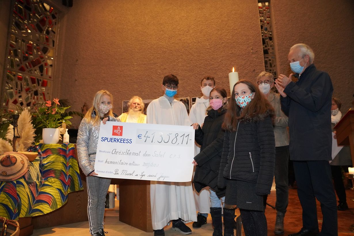 D’Hëllefsaktioun 2019-2020 « Renforcement des capacités - une clé pour un avenir meilleur » vun der Par Musel a Syr Hl. Jakobus war zugonschte vun der Fondation Chrëschte mam Sahel. Vum Advent 2019 bis zur Kommioun, déi coronabedéngt am Hierscht 2020 war, hunn d’Kommiounskanner, d’Kanner, déi Liichte gaange sinn, d’Massendénger, Veräiner a Privatleit d’Hëllefsaktioun ënnerstëtzt. Et waren och Familljen, déi am Kader vun engem Stierffall, e Spendenopruff zu Gonschte vun der Aktioun gemaach hunn. Am ganze sinn 41 358,11 € zesumme komm, dovun 4 931 € alleng vun de Kommiounen. Dobäi kommen nach 650 € vun der Lokatioun vun de Kommiounskleeder, wou d‘Elteren op de Remboursement vun der Kautioun verzicht hunn.