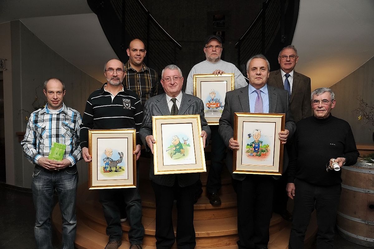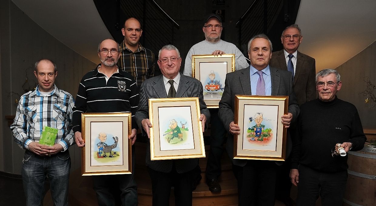 Im Rahmen der diesjährigen Abschlussfeier der Landmaschinenfirma Cloos&Kraus, Roost die neulich im Restaurant „ A Guddesch“ in Beringen stattfand, wurden mehrere Mitarbeiter für ihre langjährige Firmenangehörigkeit geehrt und zugleich in den Ruhestand verabschiedet. Firmenchef Romain Siebenaller war es vorbehalten der rund 40- köpfigen Belegschaft für die ausgezeichnete Zusammenarbeit im vergangen Firmenjahr herzlich zu danken. Sein besonderer Dank galt den langjährigen und scheidenden Mitarbeitern für ihre stete Firmentreue und wünschte einerseits eine weitere gute Zusammenarbeit und andererseits einen erholsamen Ruhestand. So konnte Patrick Kremer für seine über 20-jährige Betriebszugehörigkeit als Mechaniker eine goldene Armbanduhr in Empfang nehmen. Nicolas Schweicher seit 1965 Spezialist im Bereich der Melkmaschinen wurde zum Abschied mit einem Gutschein belohnt. Mit einer Karikatur von Roger Leiner wurden Nico Lanners, Betriebschef seit 1975, Claude Probst, Verkäufer seit 1991 sowie Chef- Mechaniker Erny Weis ( 1973) und Mechaniker Marcel Federmeyer (1980) in den Ruhestand verabschiedet.(CR)(FOTO: CHARLES REISER)