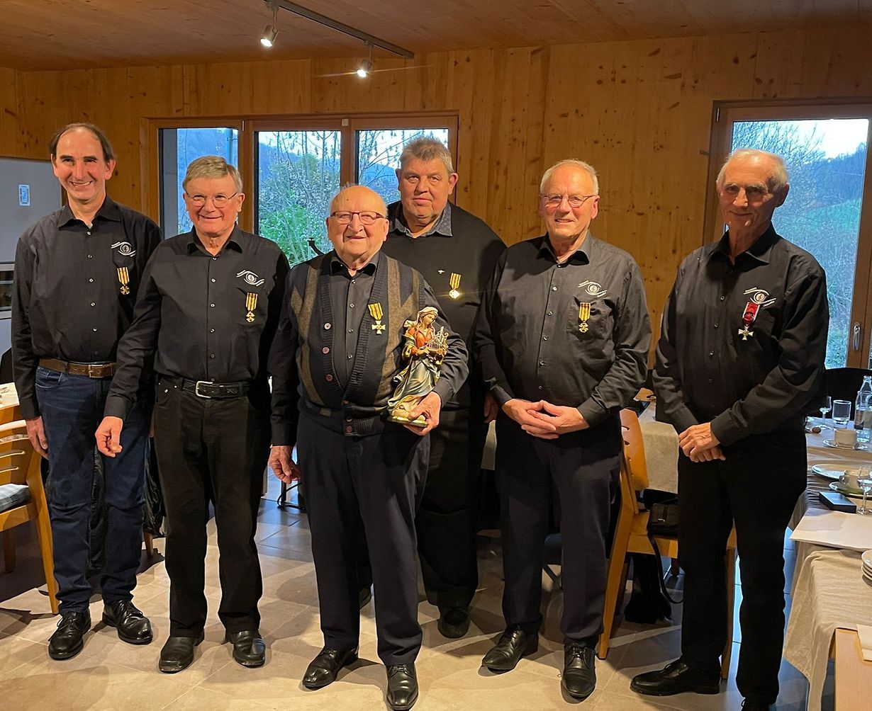 D’Fest vun der helleger Cäcilia, der Schutzpatréinesch vu Musek a Gesang, gouf mat enger feierlecher Mass an der Rousperter Kierch gefeiert. No der Cäciliemass, zelebréiert vum Här Paschtouer Luc Schreiner a feierlech gesong vun der Chorale réunie Rouspert-Ueswëller ënnert der Direktioun vum Tom Osborne a begleet op der Uergel vun der Organistin Véronique Feltes, goufen et verschidden Éierungen vun tréie Membere fir hier joerzéngtelaang Verdéngschter als Sänger, Dirigent an Organist. Sou krut den Éierendirigent Gérard Feltes d’Medaille Chevalier de l’ordre du mérite du grand-Duché de Luxembourg, den Éirenorganist Fons Ries d’Medaille Chevalier de l’Ordre Grand-Ducal de la Couronne de Chêne, den Urbain Muller, Vic Stein, Roland Ritz a Jules Fandel d’Medaille en vermeil de l’Ordre Grand-Ducal de la Couronne de Chêne an den Henri Zeimetz d’Medaille Officier de l‘ordre de Mérite. Eng besonnesch Freed an Éier war et der Presidentin Véronique Feltes fir hirem Organistekolleeg Fons Ries, deen no 60 Joer a seng wuelverdéngte musikalesch Pensioun gaang ass, eng passend Auer mat Gravure am Numm vum ganze Veräin ze iwwerreechen. Uschléissend un d’Wieder vun der Presidentin huet den Här Paschtouer Luc Schreiner dem Här Ries eng faarweg Holzstatue vun der Helleger Cäcilia am Numm vun der ganzer Par iwwerreecht an a senger Ried e grousse Merci a Vergelt‘s Gott ausgesprach. Bei engem gudde Maufel a gemittlecher Atmosphär sen des virbildlech Jubilare besonnesch gefeiert ginn an et goufen e puer flotter Stonnen zesumme verbruecht.
