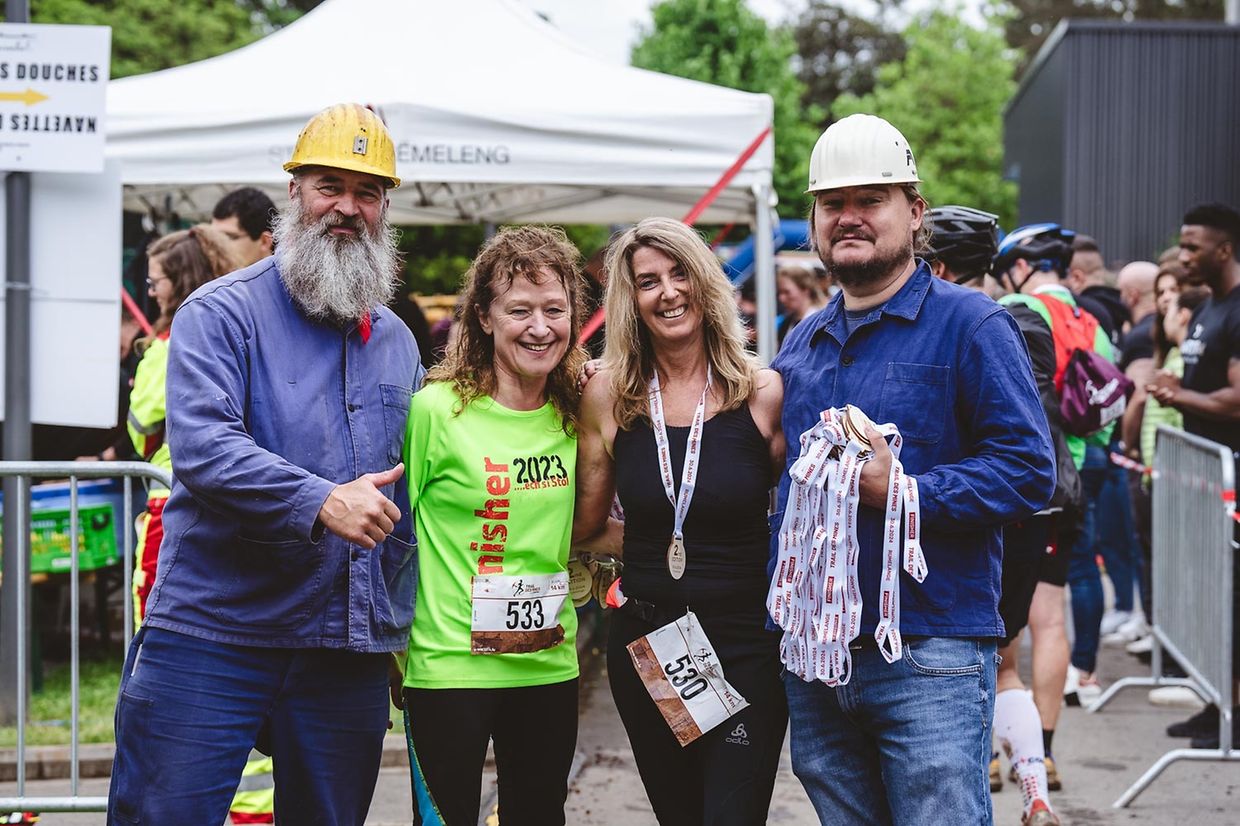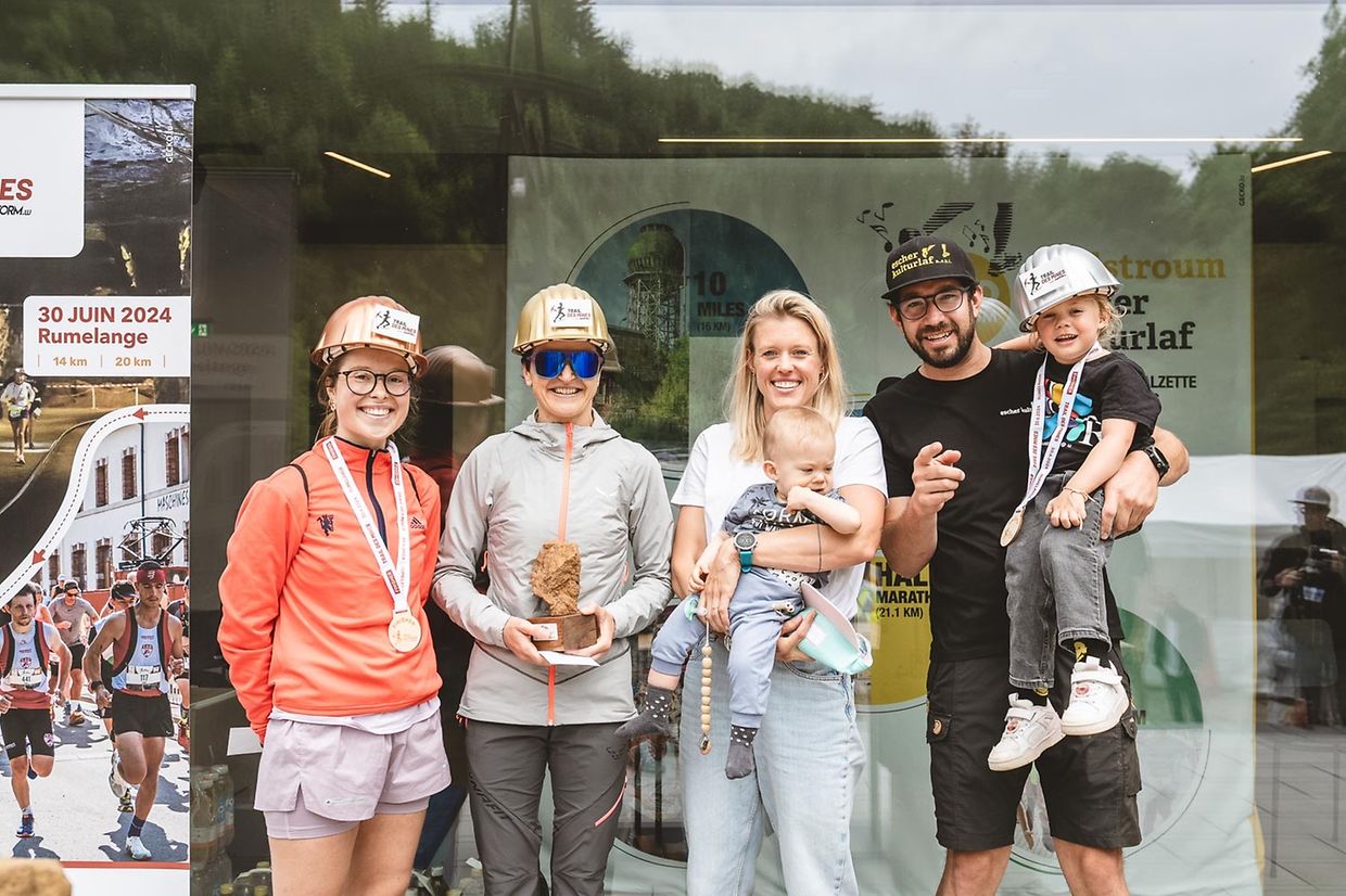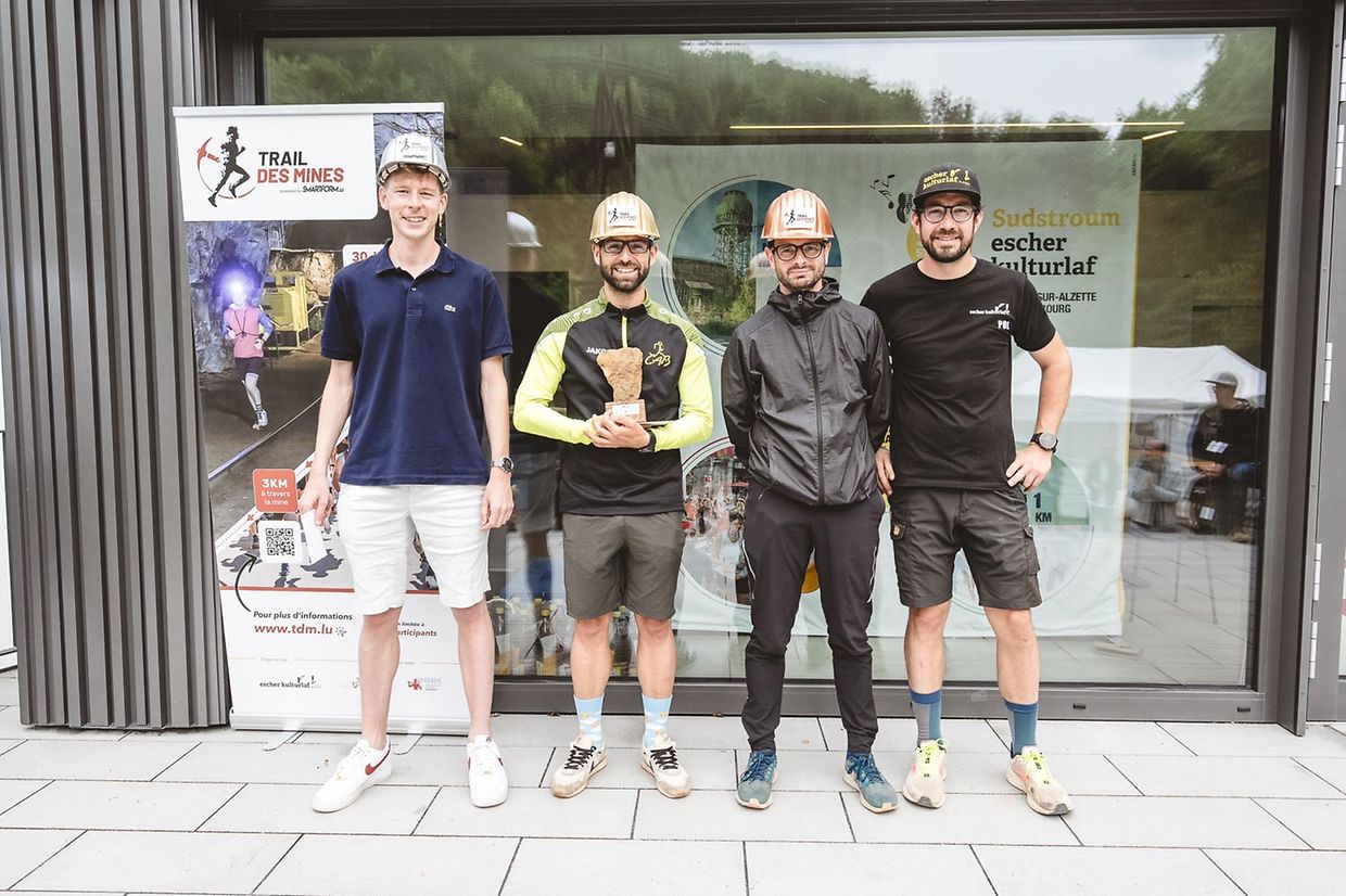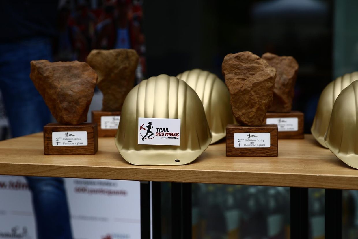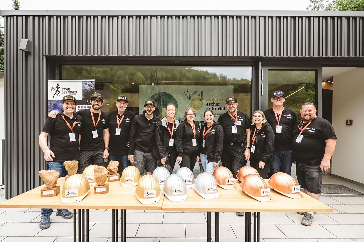 Von den 589 eingeschriebenen Läufern – die Teilnehmerzahl war diesmal auf 600 begrenzt – fanden sich aber nur 451 Frauen und Männer am Start ein. Ein Grund dafür waren sicherlich die widrigen Witterungsverhältnisse wenige Stunden vor dem Start mit Sturmböen und Starkregen. Als kleine Belohnung für ihre Teilnahme und ihr Durchhalten wurde ihnen am Ziel beim „Musée national des Mines“ eine Erinnerungsmedaille aus Holz von Mitarbeitern in traditioneller Bergmannskleidung überreicht. Dem Event angepasst waren auch die Preise für die Erstplatzierten: Neben einem Geldbetrag erhielten sie einen Helm in den Farben Gold, Silber bzw. Bronze. Und für die Sieger der einzelnen Kategorien gab es zudem eine aus einem Rümelinger Minettestein gefertigte Skulptur.
