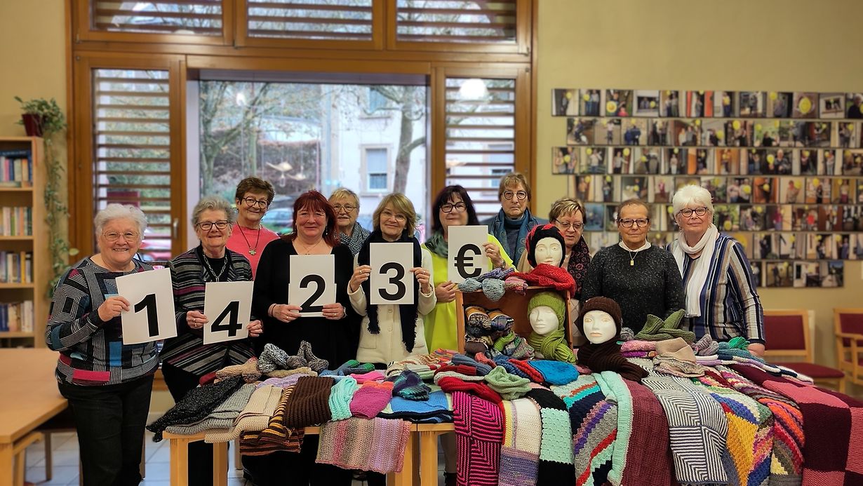 An engem Joer sinn eng 63 Decken, sëlleg Mutzen, Schalen , Strëmp a Händsche gestreckt a gehäkelt ginn. D`Handarbeschten sinn den 18. Dezember 2024 der Associatioun "Amis de la Communauté Catholique de Bonnevoie (ACCB)" iwwerrecht ginn. D`Sozialequipe vun der ACCB ënnerstëtzt sozial schwaach Mënschen a Mënschen ouni Wunneng.Durch den Verkaaf vun Handaarbechten konnten sie ee stolzen Don vun 1423€ un d`Organisation machen.