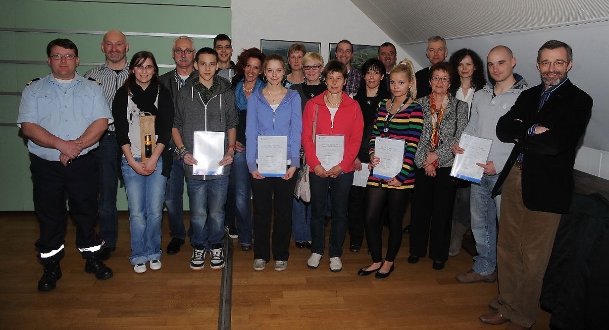 Um im Notfall mit dem richtigen Handgriff sofort eingreifen zu können, zeigten gleich 14 angehende Sekuristen Interesse in 14 Doppelstunden am Erste- Hilfe Kursus teilzunehmen, der vom 10. Januar bis zum 27. März von dem Roten Kreuz in Zusammenarbeit mit dem lokalen Rettungsdienst und der Gemeindeverwaltung Saeul organisiert worden war. Unter der fachmännischen Leitung von Instruktorin Sarah Klepper erlernten die Teilnehmer die lebensrettenden Handgriffe. Im Rahmen der Diplomüberreichung, die dieser Tage im Rathaus in Saeul stattfand, beglückwünschte Bürgermeister Raoul Clausse alle Teilnehmer und zeigte sich beeindruckt von den zahlreichen Jugendlichen, die ihre Freizeit opferten um im Notfall Leben retten zu können. Seitens der Direktion des Roten Kreuzes, hob Nico Hüber die Wichtigkeit gut ausgebildeter Bürger hervor, um im richtigen Augenblick Menschen in Not zu helfen. Zugleich rief Hüber alle Teilnehmer auf, sich als Blutspender zu melden, um auch in Zukunft über genügende Blutreserven zu garantieren. Sein besonderer Dank galt Instruktorin Sarah Klepper sowie Jeanne Paler – Schmitz die sich spontan bereit erklärte, als „ Quêteuse“ in der Gemeinde Saeul zugunsten des Roten- Kreuzes zu dienen. Seitens einer Delegation des Zivilschutzes aus Redingen/ Attert kam die Bitte dem Redinger Zenter beizutreten um sich als Krankenwagenfahrer zu melden um auch in Zukunft die stete Einsatzbereitschaft rund um die Uhr beim Ambulanzdienst zu gewährleisten. Im Anschluss an die Glückwünsche von Korpschef Laurent Gengler konnten folgende Absolventen ihr Diplom in Empfang nehmen: Diane Birkel, Malou Bodem-Bernotte, Patricia Bosseler, Tun Clausse, Cheryl Eilenbecker, Véronique Grasges, Francis Hansen, Félix Loos, Sonja Loos-Schmitz, André Muller, Malou Muller- Fairon, Ginette Wagner, Simone Wagner und Nicolas Zoller. ( FOTO: CHARLES REISER)