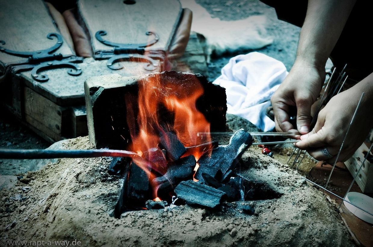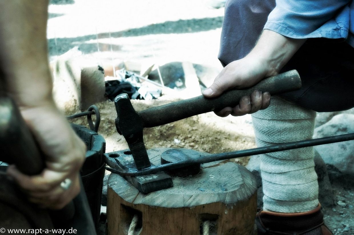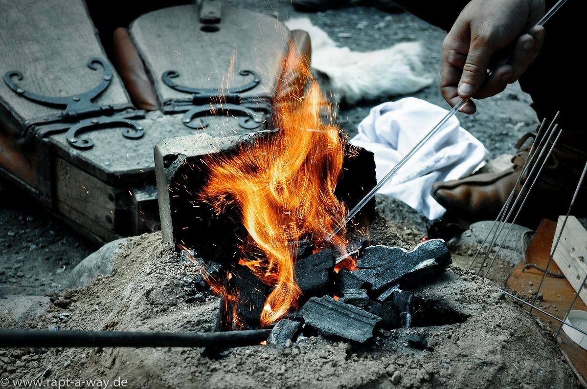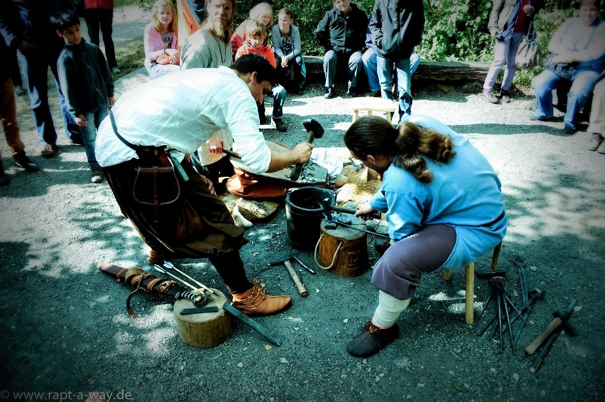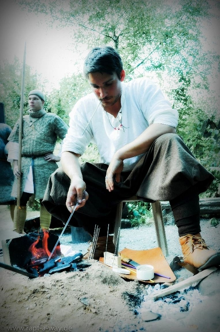 Abends tauschte man sich über Funde und historische Fakten aus und tagsüber boten wir den Besuchern der Veranstaltung Handwerksvorführungen, wie bspw Glasperlen über offenem Feuer drehen, Schmieden, textile Handwerke, wie Brettchenweben und Nadelbinden.