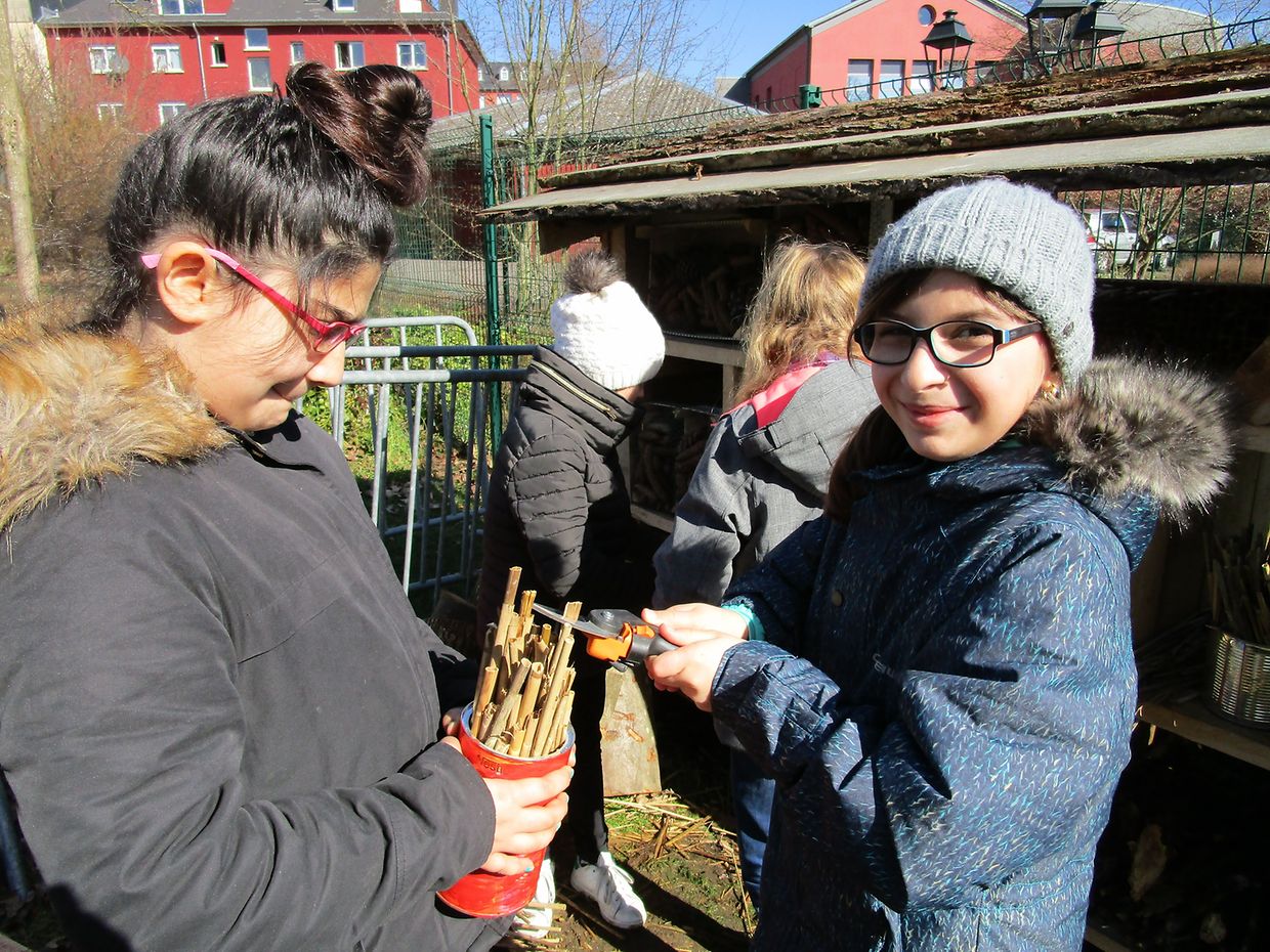 Auf Initiative der Lehrerin Susana Dinis wurde das Thema Wildbienen von den Kindern auf praktische Art angegangen. Doris Bauer von der Biologischen Station SIAS begleitete die Arbeiten.