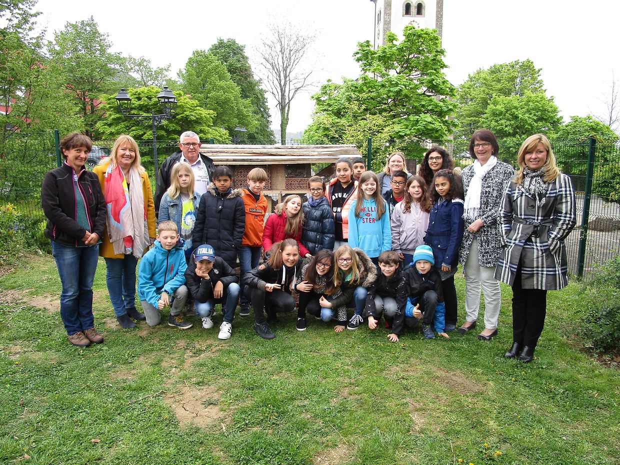 Am vergangenen 5. Mai erhielten die Schulkinder der Klasse 3.2 in Sandweiler tatkräftige Unterstützung bei der Fertigstellung ihres Wildbienenhotels im Schulhof 'Um Weier' durch die Bürgermeisterin Simone Massard-Stitz und die Schöffinnen Jacqueline Breuer und Yolande Roller-Lang.