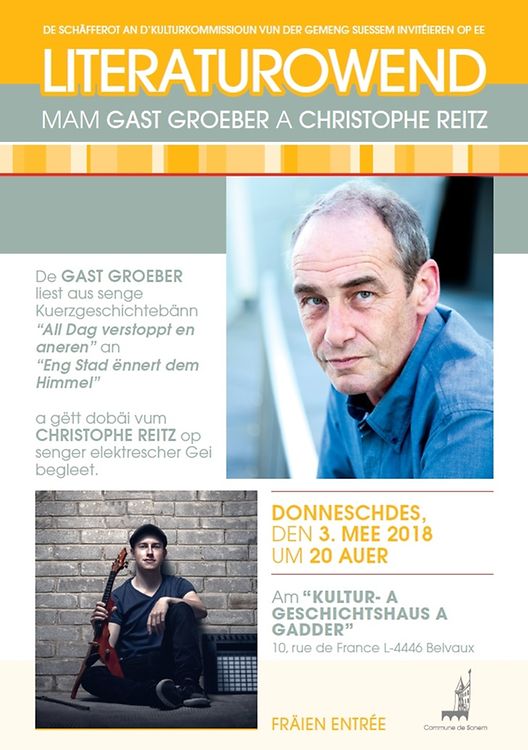 De Schäfferot an d'Kulturkommissioun lueden an op ee Literaturowend mam Gast Groeber a Christophe Reitz. Den Entrée ass fräi!