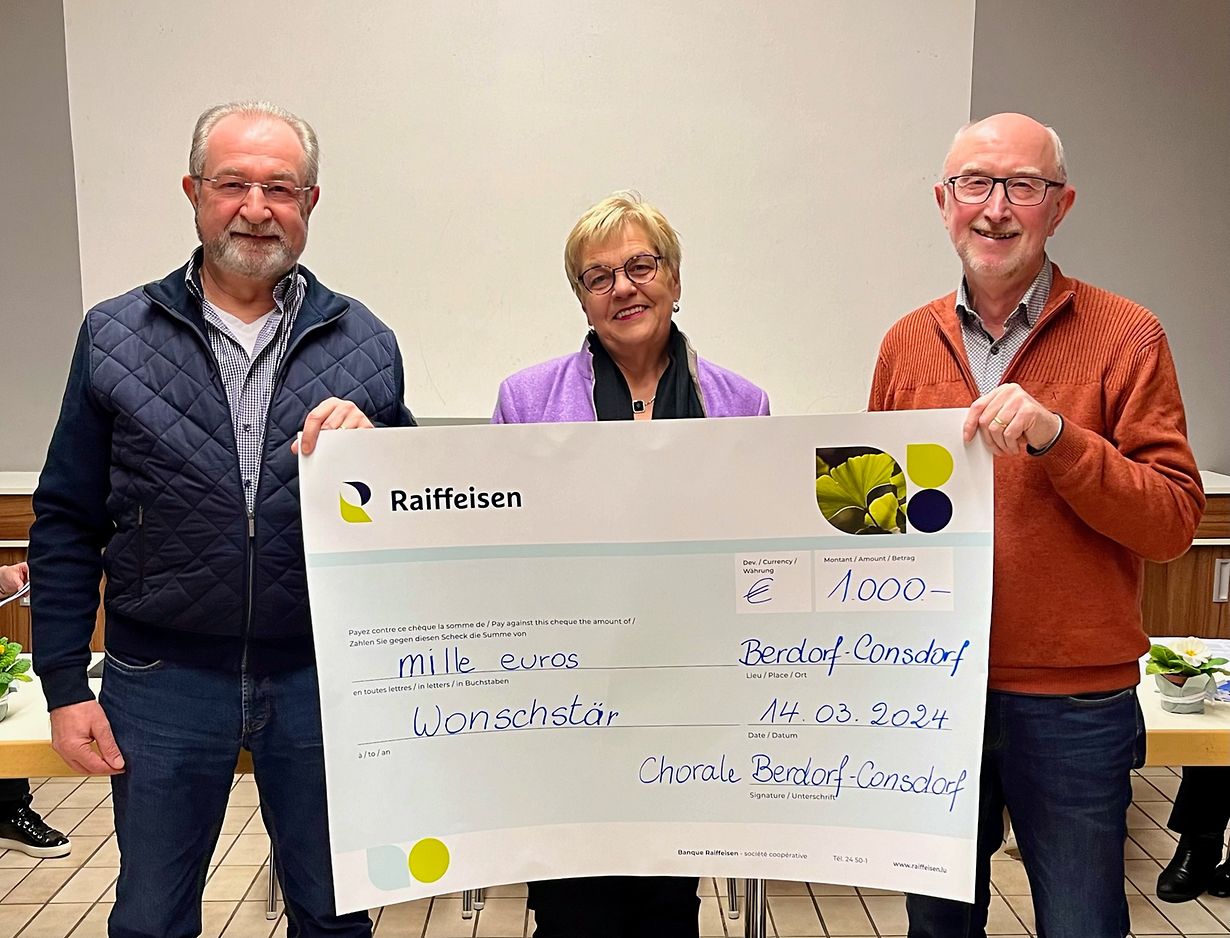 Am Kader vun der Assemblée Générale huet d’Chorale Berdorf-Consdorf e Scheck vun 1000 € un d’Fondatioun «Wonschstär» iwwerreecht. Dës Zomm ass d’Resultat vun der Quête nom Chrëschtconcert ufangs 2024 an der Kierch zu Bäertref.