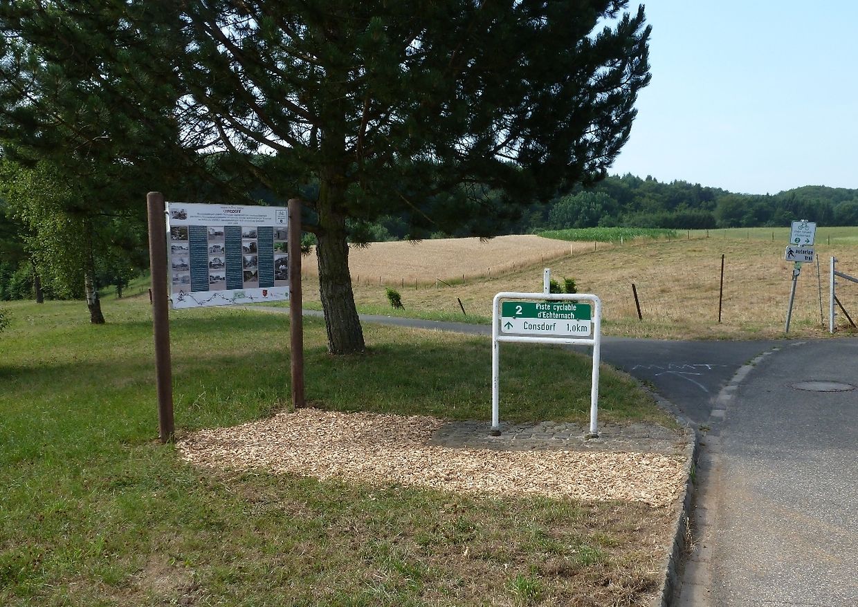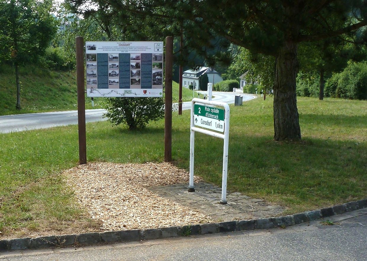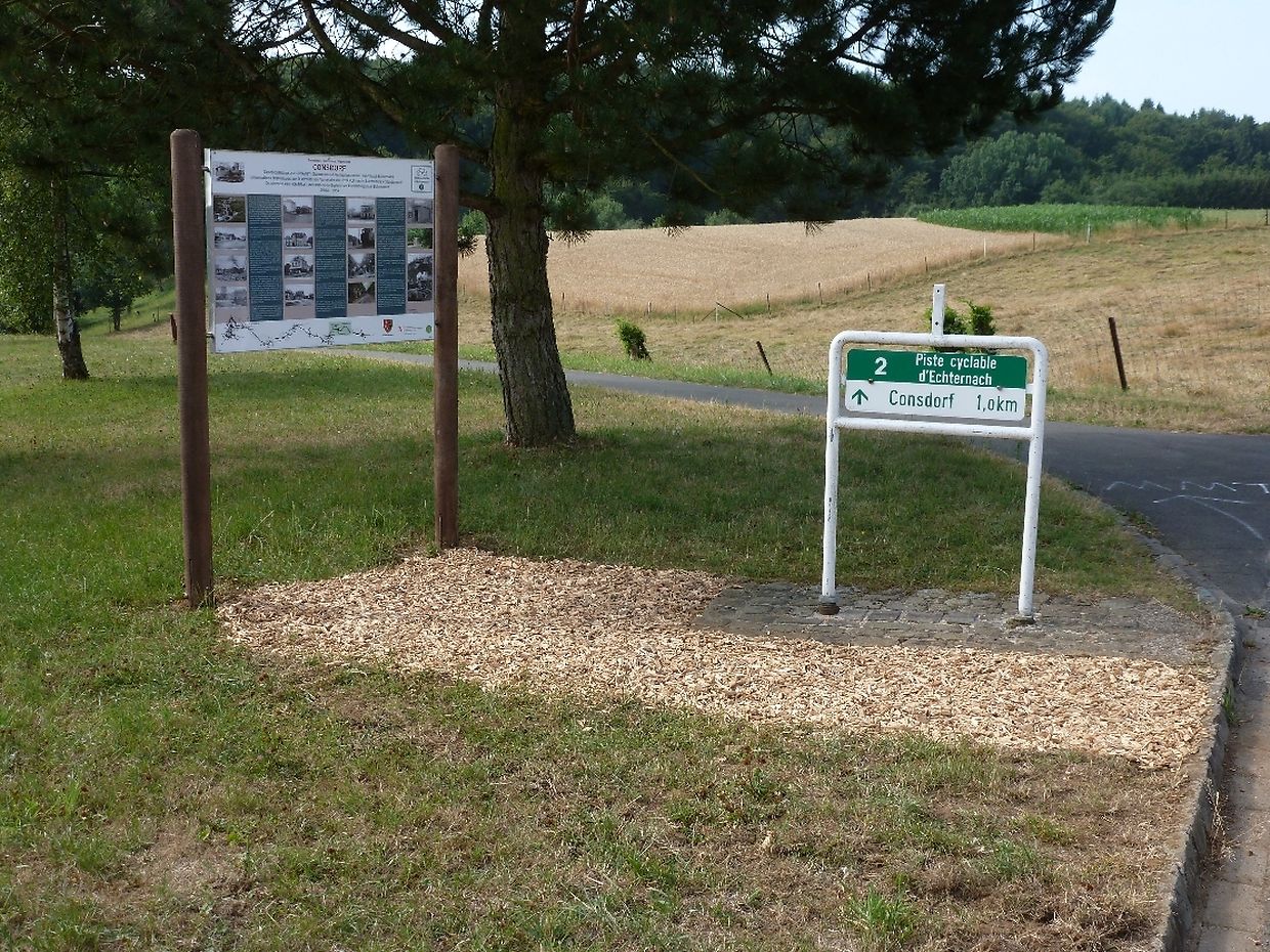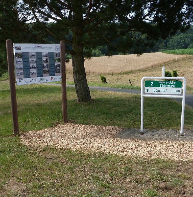 Durch das Verteilen von Mulch vor dieser Informationstafel, welche über die Geschichte der Eisenbahn auf dem Gebiet der Gemeinde Consdorf informiert, wird der hier Vorbeikommende eingeladen, sich diese Tafel anzuschauen, er wird auf diese Tafel quasi aufmerksam gemacht. An dieser Tafel Interessierte hatten vorher Bedenken den Rasen zu betreten, auch war ein nasser Rasen für das Betreten der Rasenfläche abschreckend.