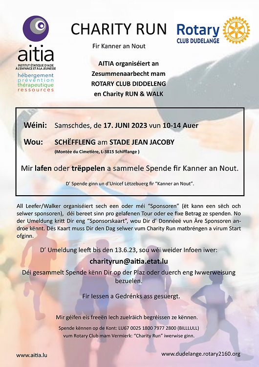 Nom groussen Erfolleg vun 2022, wou mir 7550€ fir de gudden Zweck sammele konnten, organiséieren Aitia an de Rotary Club Dudelange och dëst Joer nees een Charity Run.