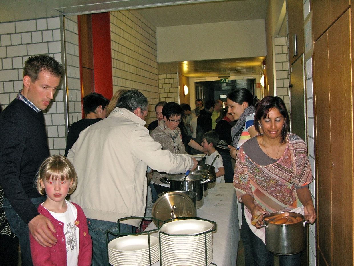 Währenddem eis Gäscht duerch d’Staat flanéiert sinn, goufen an der Schoul schons rëm Diren opgespaart: D’Eltre vun eise Kanner hunn d’Iessen, wat se Doheem préparéiert hunn, an d’Schoul bruecht. Vill fläissech Bénévolen hu schons mëttes an eiser Schoulkichen an den Dëppe geréiert, am Gank Dëscher fir de Buffet opgeriicht oder an der Sportshal Dëscher a Bänken fir owes gesat.