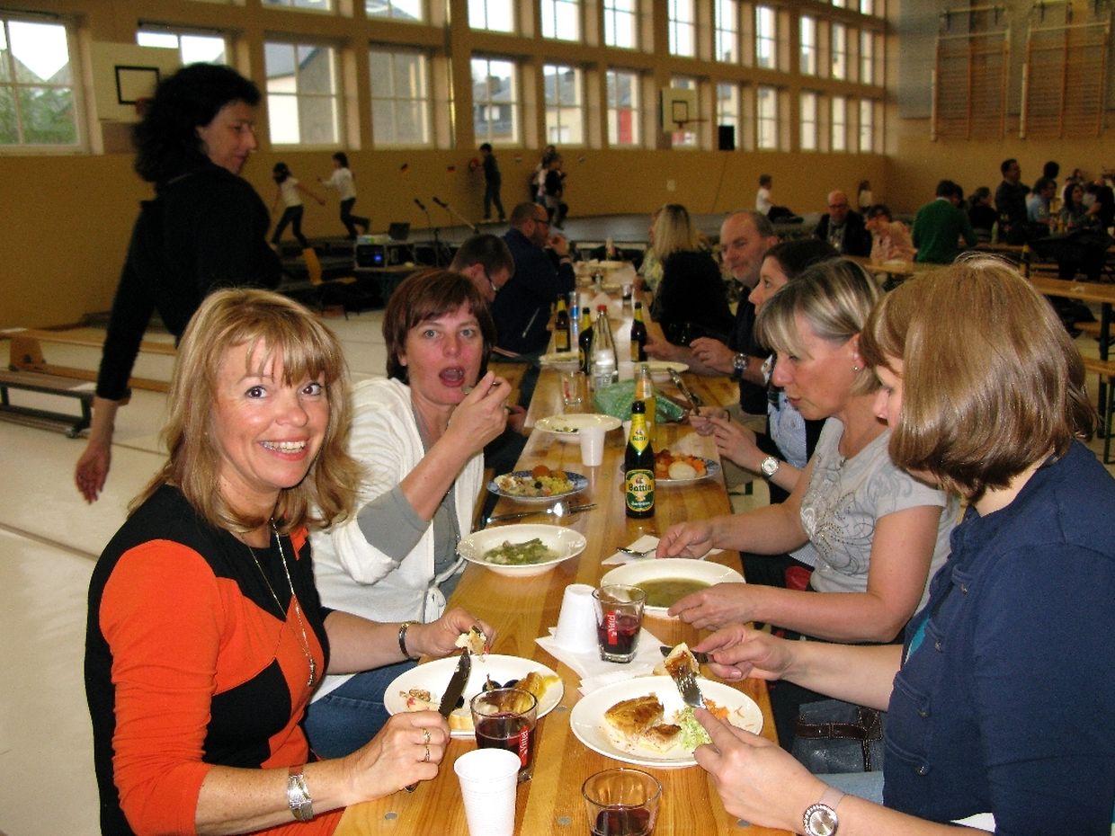 Den Applaus vun den Eltren huet Grouss a Kleng richteg frou a stolz gemeet. Zesumme gouf e Patt gedronk an d’Häppecher, déi fir den Appéritif firgesinn waren, ware séier giess. Immens flott war dono dat gemeinsamt Iessen mat de Kanner, hiren Eltren an de Comeniuspartner. De Rush op de Buffet war enorm, mee dat war och ze verstoen, et huet immens gudd geroch. Eis flott Soirée, déi am Zeechen vum sproochlechen, kulinarëschen a sozialen Austausch stung, gouf nom Dessert nach ganz relax ausklénge gelooss.