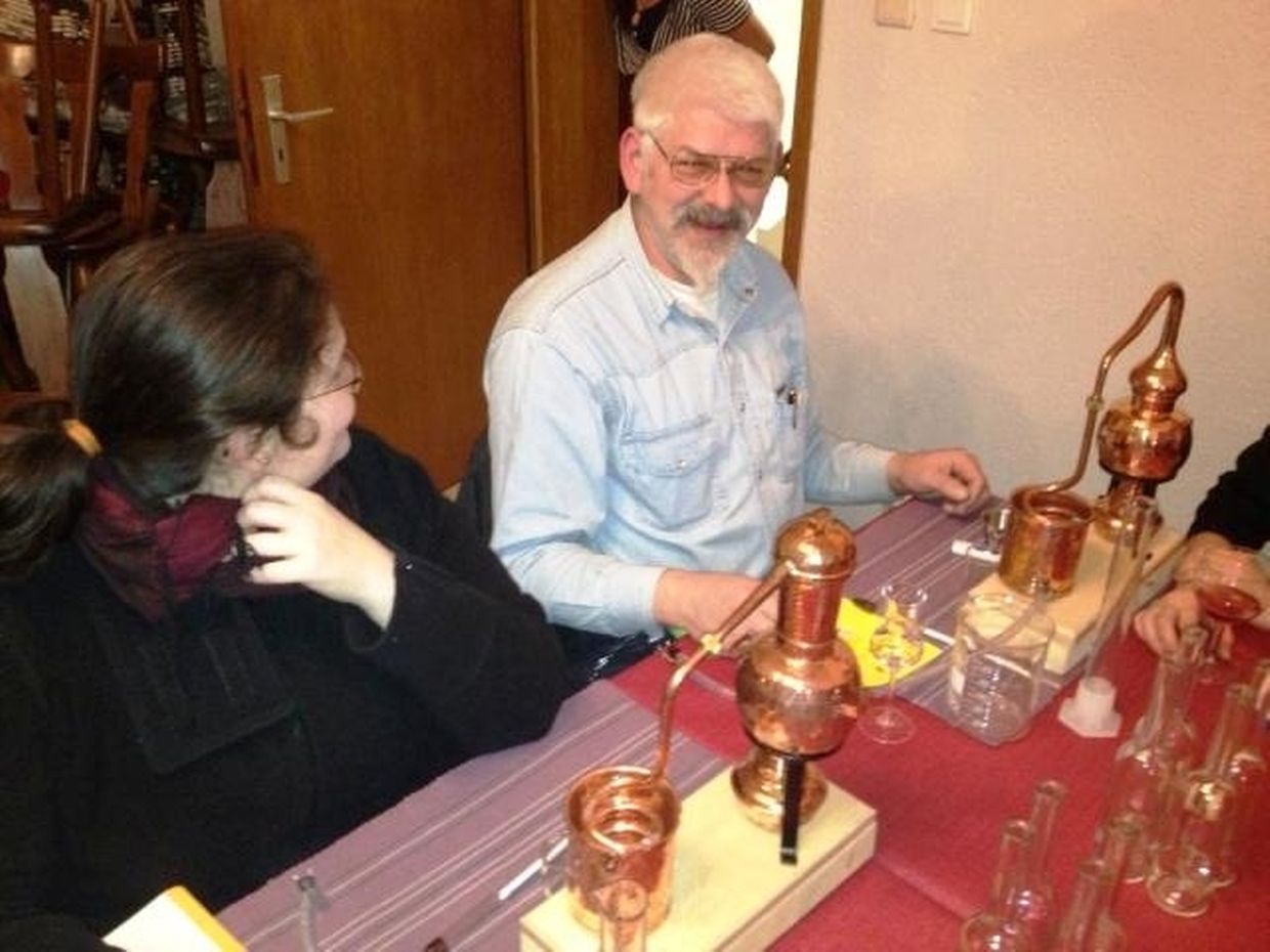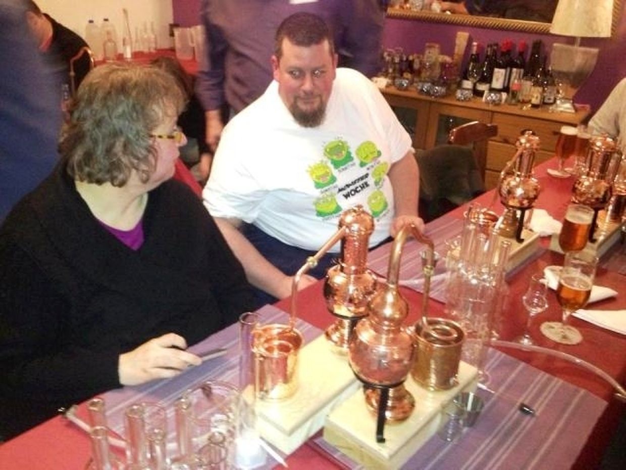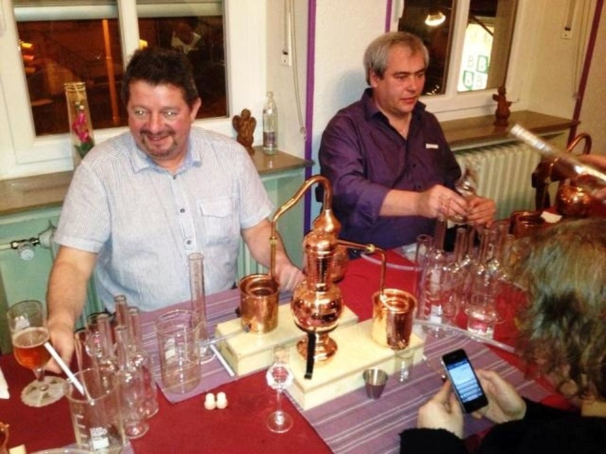 Dass dieses Thema viel Interesse erweckt, zeigt nicht zu Letzt die Tatsache, dass das Seminar ausgebucht war, sondern auch das Interesse der Medien. Nach einem guten Abendessen im Café de l'Avenue, konnte man sich gestärkt dem geistvollen Thema widmen. Brennmeister Kai Hofstetter erklärte den anwesenden Teilnehmern in lustiger und lockerer Art und Weise die Geschichte des Brennens, und erklärte fachkundig die Praxis. Mit kleinen Destillen konnte man dann auch sogleich eigene praktische Erfahrung machen.
