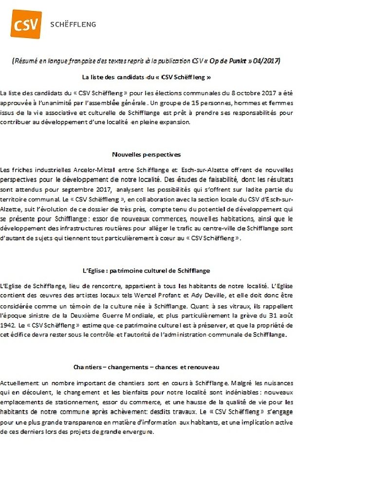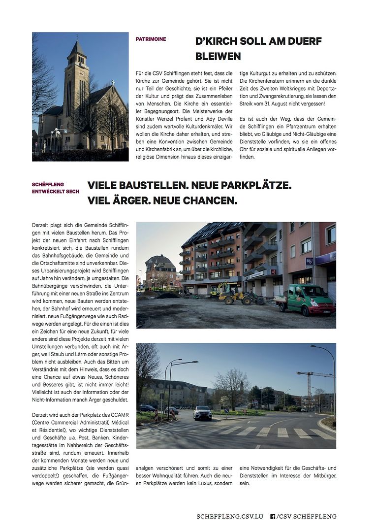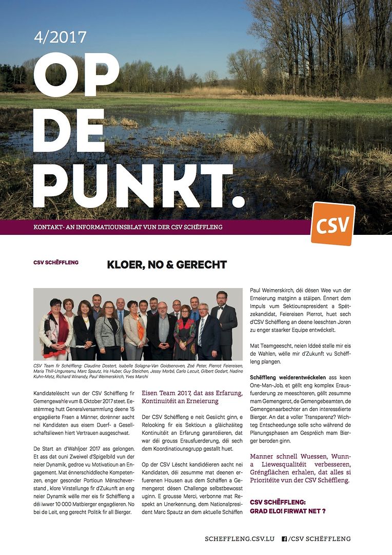 Schifflingen Op de Punkt: Kontakt an Informatiounsblatt Abrëll 2017 CSV - Schëffleng 5 Bildergalerie Bitte scrollen Sie nach unten,um weitere Bilder zu sehen. Veröffentlicht am Dienstag, 2. Mai 2017 um 14:58 Schifflingen, Luxemburg Unpassenden Inhalt angeben Weitere Neuigkeiten von CSV - Schëffleng > Dialog mam Bierger: CSV Schëffleng Präsenz am Duerf 29.05.17 Schifflingen CSV : Grad elo, firwat net. 29.05.17 Schifflingen Zukunft plangen 29.05.17 Schifflingen Kandidaten fir Gemengewahlen vum 8.Oktober 2017 12.05.17 Schifflingen CSV Schëffleng: Schëffleng liewen, CSV wielen. 08.05.17 Schifflingen