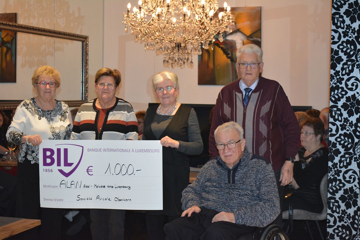 EWEI ALL JOER HUET DEN UEWERKUER KLENGDEIERENVERÄIN SENG TRADITIONELL OFSCHLOSSFEIER VUM JOER E SAMSDESCHN DEN 15.DEZEMBER 2018 AM KLENGE CASINO ZU DEFFERDENG OFGEHALEN.BEI DER UWIESENHET VUN ENGER GROUSSER ZUEL VU MEMBEREN,HUET DE VERÄINS PRÄSIDENT PAUL FABER DEM HÄR FONS ANSAY,VERTRIEDER VUN DER GESELLSCHAFT ALAN,MALADIES RARES LUXEMBOURG E SCHECK VUN 1.000.-EUROS IWERRECHT.MAT INTERESSANTEN INFORMATIONEN IWWER DI VERGANGEN AKTIVIEITEN AN DI ZUKÜNFTEG PLÄNG,KONNTEN DI UWIESEND VERÄNSMEMBEREN E PUER FLOTT STONNEN AN ENGER GEMITLECHER ATMOSFÄR VERBRENGEN.