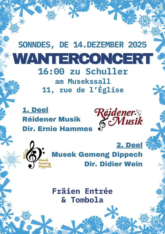 D’Musek Gemeng Dippech invitéiert zesumme mat der Réidener Musik op hieren traditionelle Wanterconcert den 14. Dezember 2025 um 16:00 Auer am Musekssall zu Schuller (11, rue de l’Église). E flotte musikalesche Nomëtteg waart op Iech an dat ënnert der Leedung vum Ernie Hammes a Didier Wein. Fräien Entrée a Tombola garantéieren eng gemittlech Ambiance.