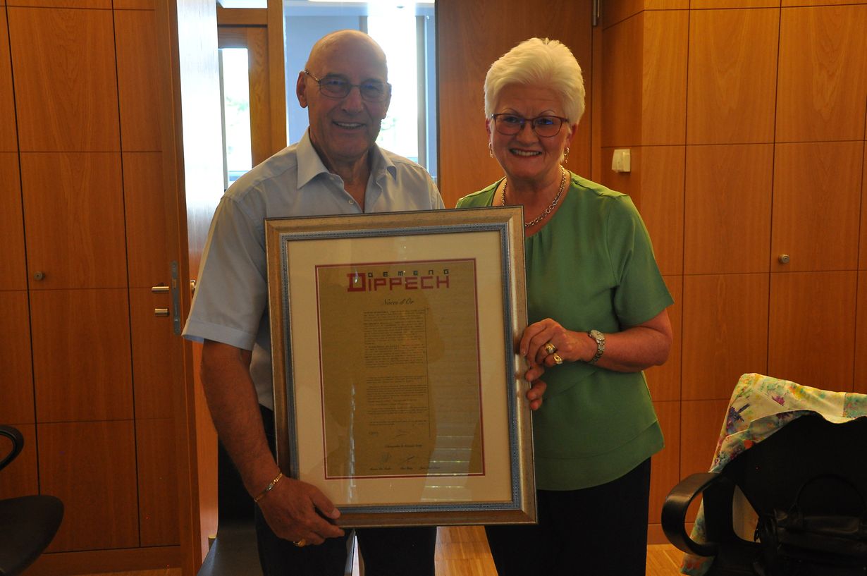 Den 23. August huet d’Gemeng Dippech d’Éier gehat d’Gëllenhochzäit vum Brautpuer Bodson-Kraemer ze feieren. 50 Joer beieneen ze bleiwen ass an den haitegen Deeg eng Leeschtung a mir als Gemeng sinn ëmmer erëm frou e gëllent Brautpuer hei z’empfänken.