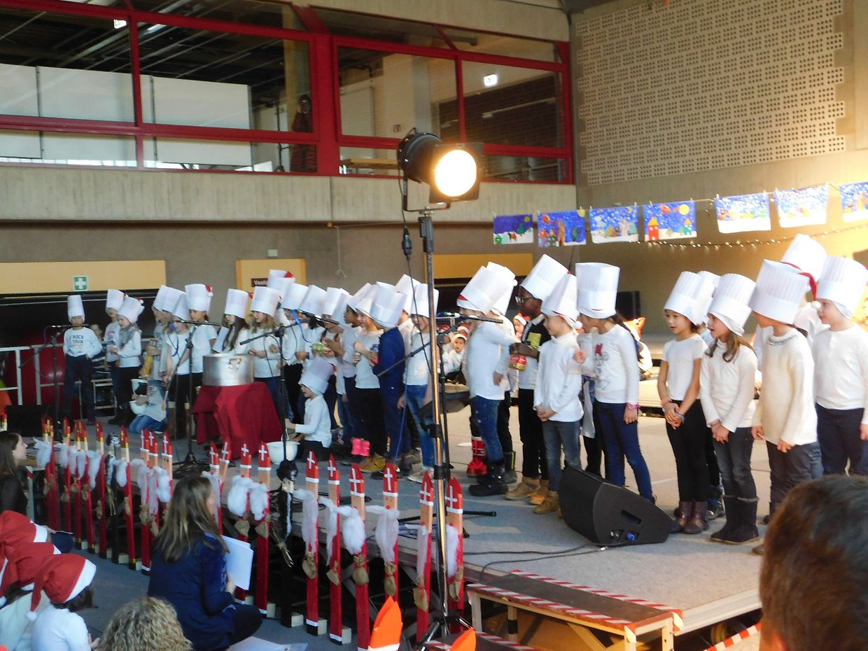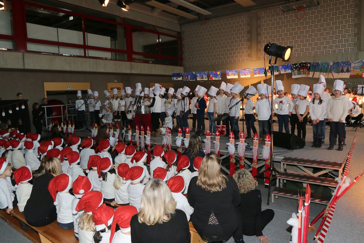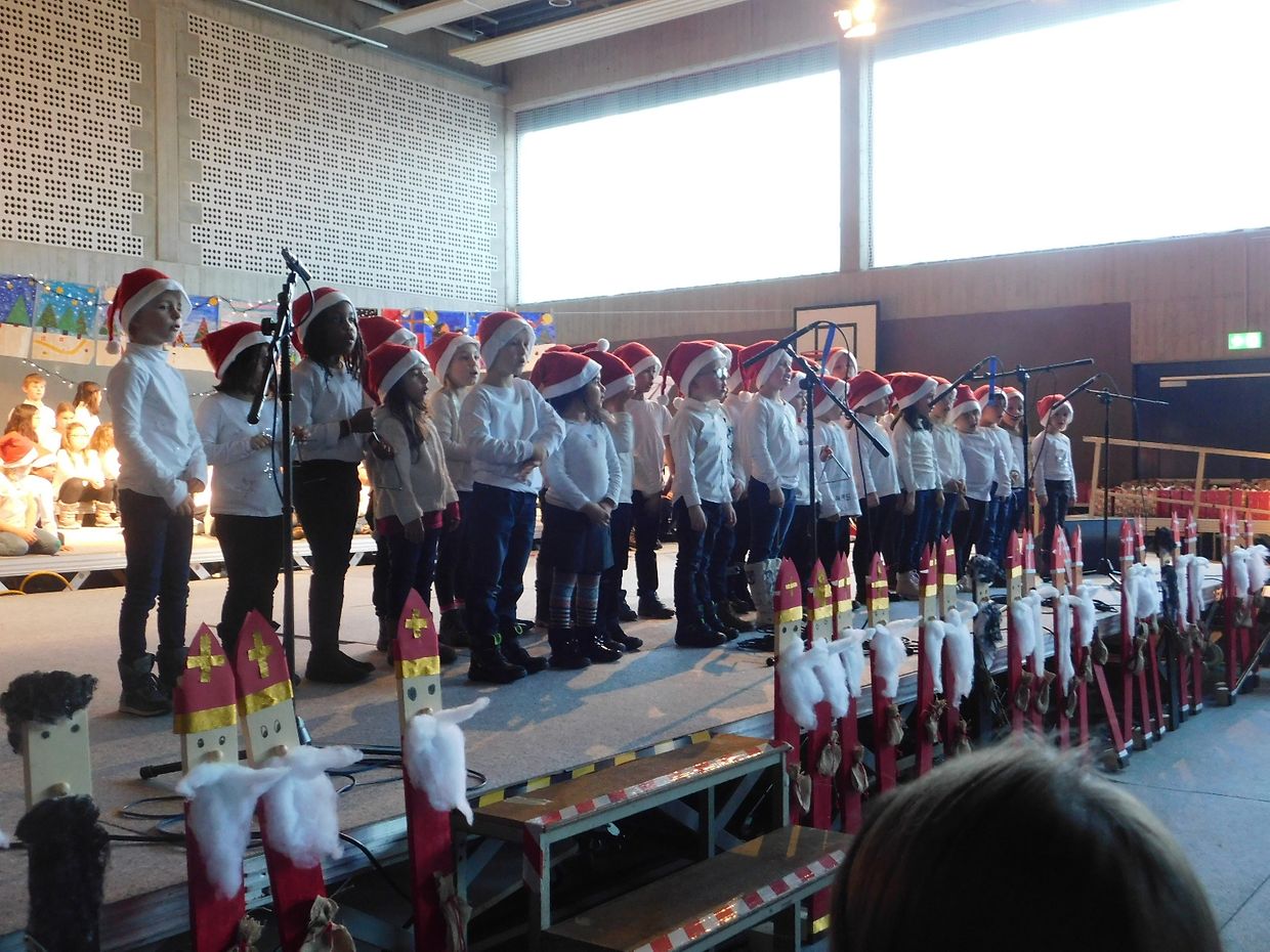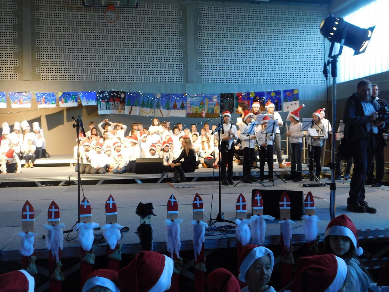 Net nëmmen déi 215 Kanner op der Bühn, mee och d’Schüler aus dem Cycle 3 & 4, déi op hiren traditionnellen Niklosmaart mat Kaffisstuff invitéiert hunn, hu fir eng gutt Stëmmung am Gebai gesuergt.