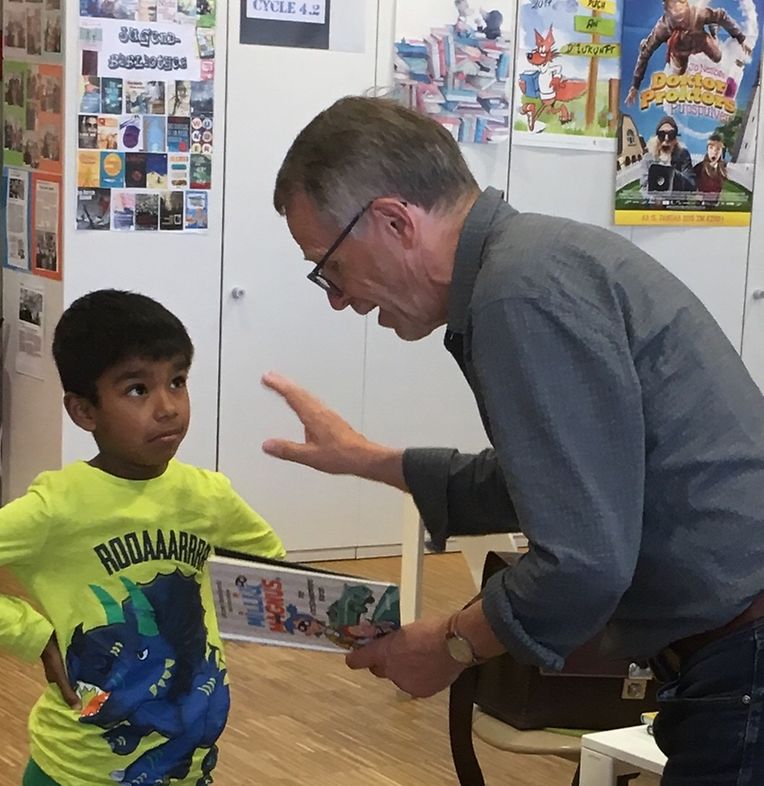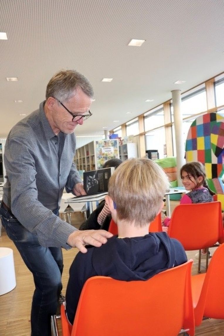 Er ist Profi. Er kann vorlesen und Grundschüler in seinen Bann ziehen. Schließlich schreibt er Kinderbücher und weiß wie man Kinder an der Stange hält.