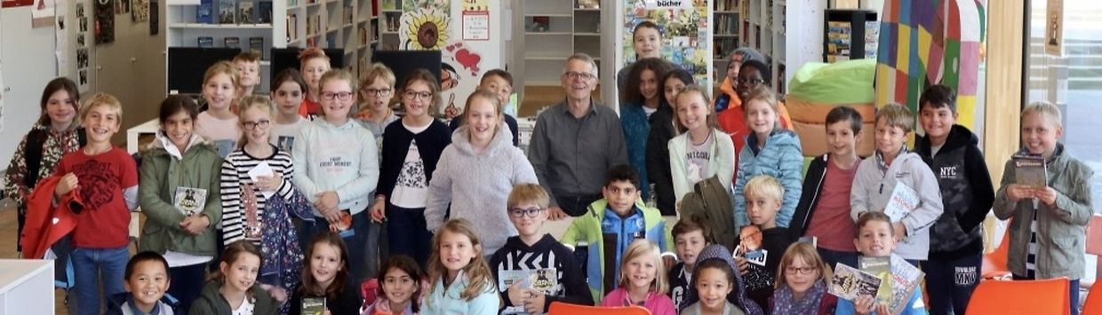 Zu Besuch ist Jürgen Banscherus, Kinder- und Jugendbuchautor; geistiger Vater von Detektiv Kwiatkowski, dem ungleichen Paar Milli und Magnus und etlichen anderen Kinderbuchfiguren. Er hat sich heute viel vorgenommen. Mit 3 Lesungen für Zyklus 2.2, 3.1 und 3.2 ist er zu Gast in der Grundschule „An der Dällt“ in Münsbach, zum wiederholten Male. Die Kinder hängen an seinen Lippen und genießen die Reise in die Fantasiewelt des Lesens.