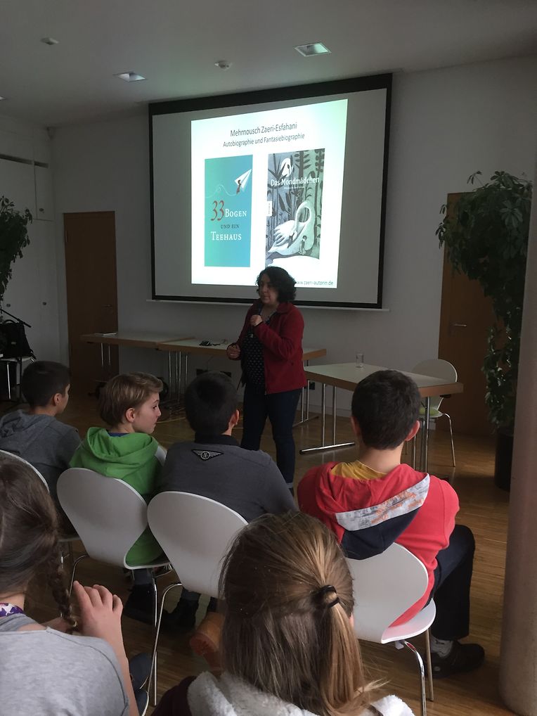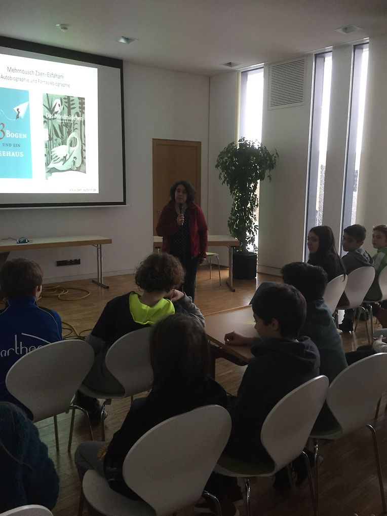 Während der Diskussionsrunde, hat Frau Mehrnousch Zaeri-Esfahani über ihre Kindheit im Iran, die dort gültigen Regeln und ihre Flucht berichtet. Sie hat uns Bilder von sich und ihrer Familie gezeigt, und sie beschrieben, und mit großer Freude unsere Fragen beantwortet.