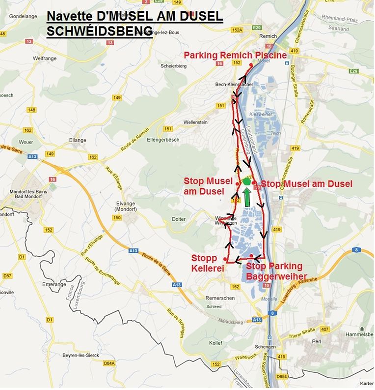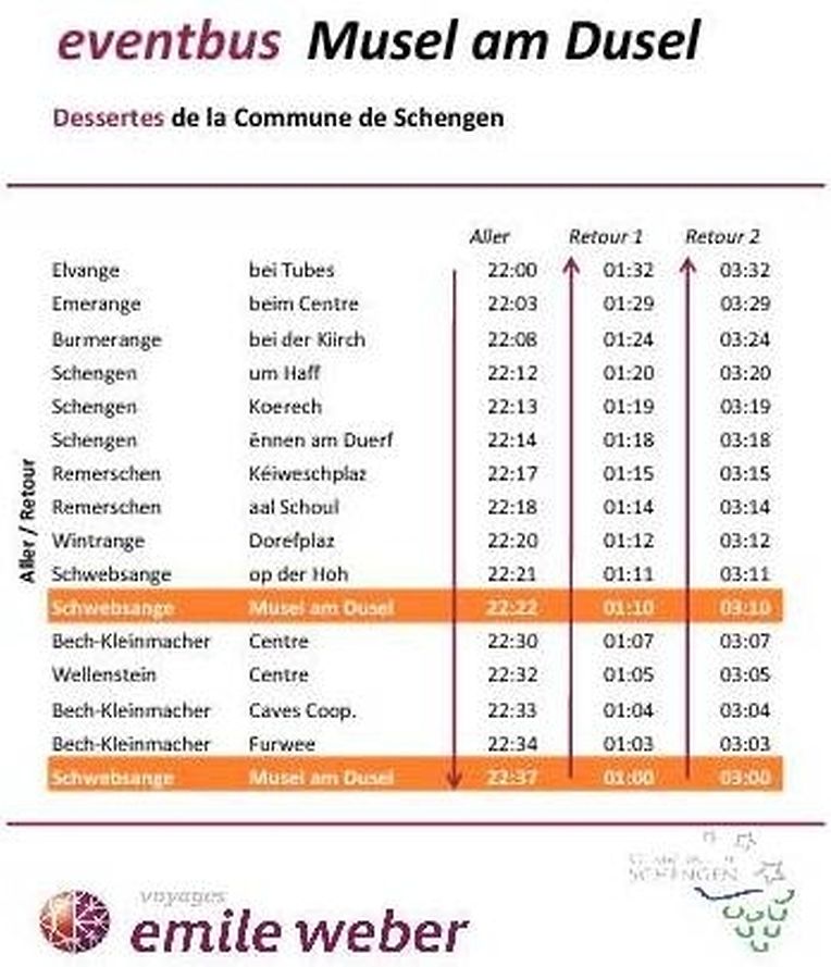 Von der Gemeinde Schengen ist eine interkommunale Busnavette innerhalb der 9 Dörfer organisiert. (siehe Plan "eventbus Musel am Dusel").