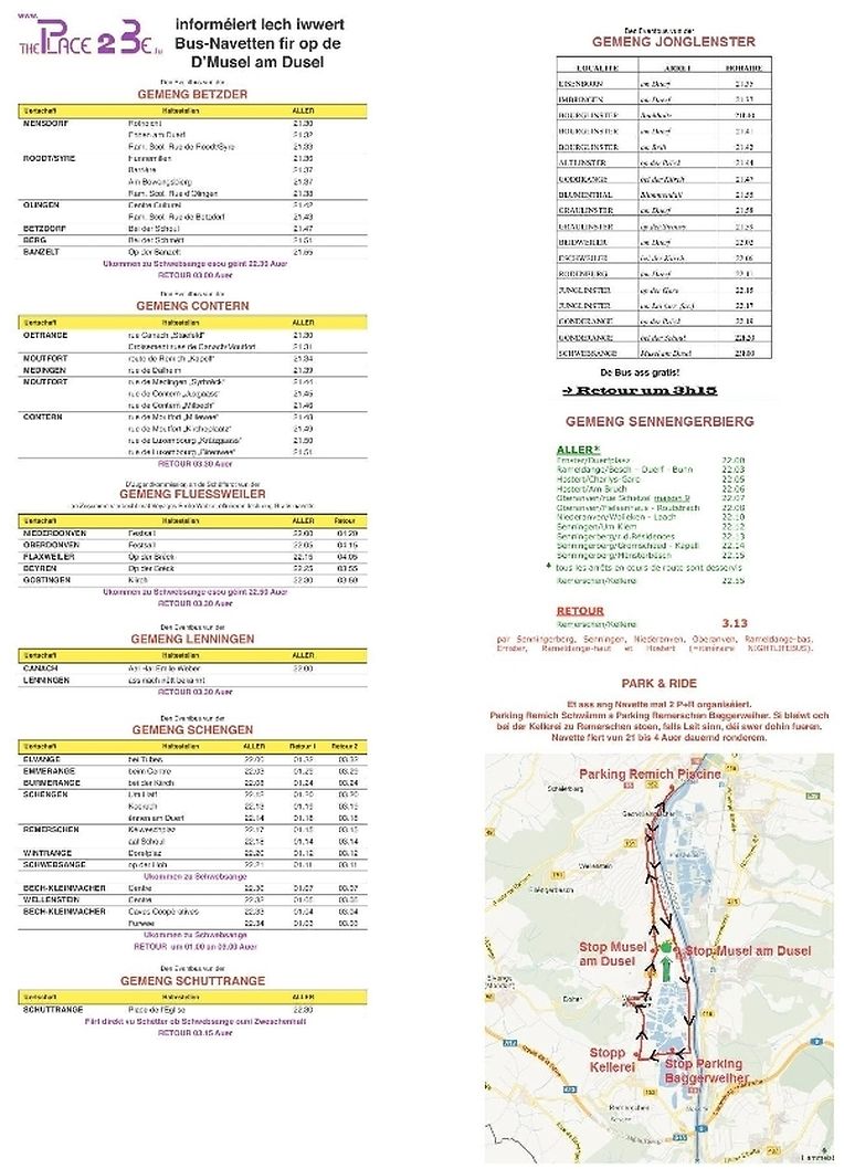 Außerdem wurde eine Busnavette mit zwei P+R organisiert, welche von 21 bis 4 Uhr ständig ihre Rundfahrt macht. P+R in Remich beim Schwimmbad und P+R in Remerschen beim Baggerweiher. Vorgesehen ist auch ein Stopp bei der Kellerei in Remerschen. (siehe Karte)