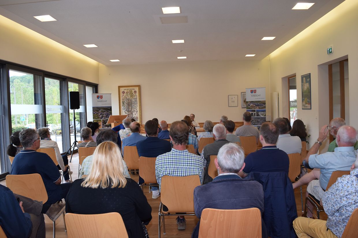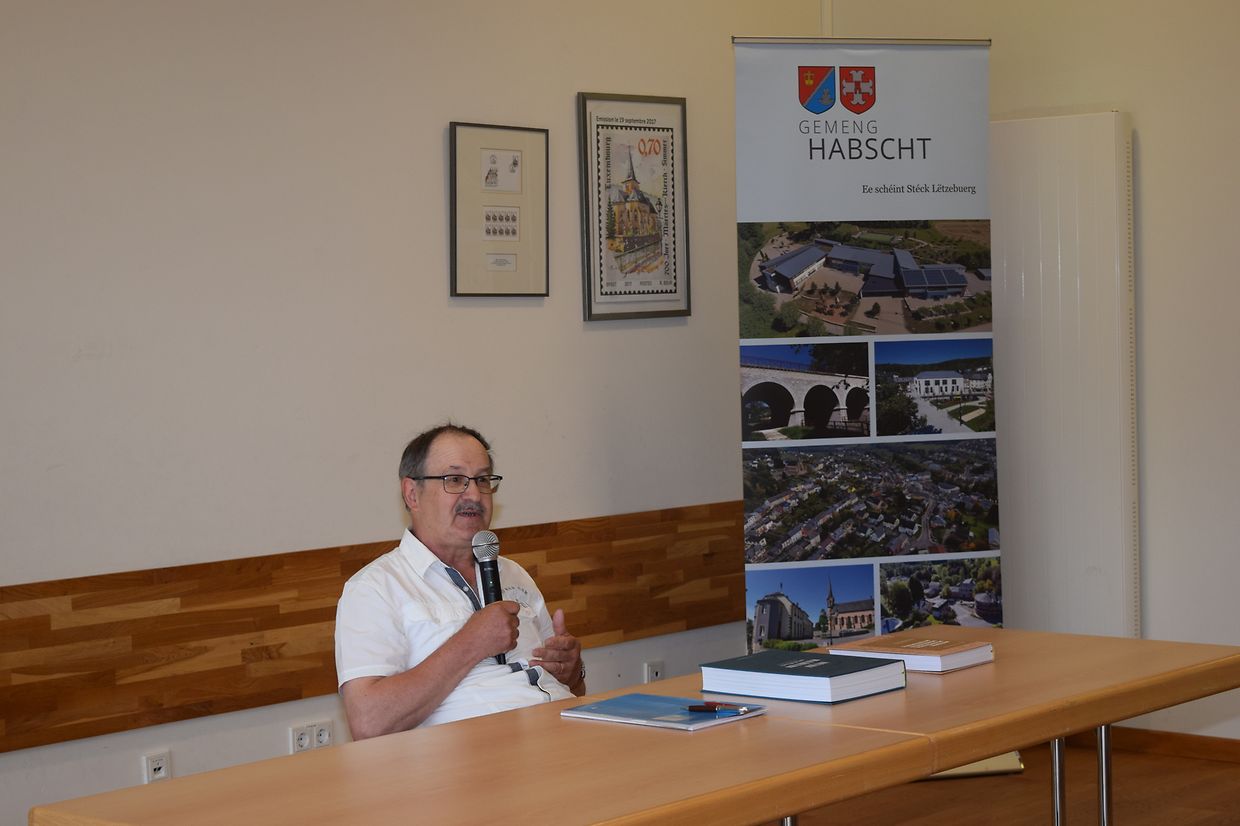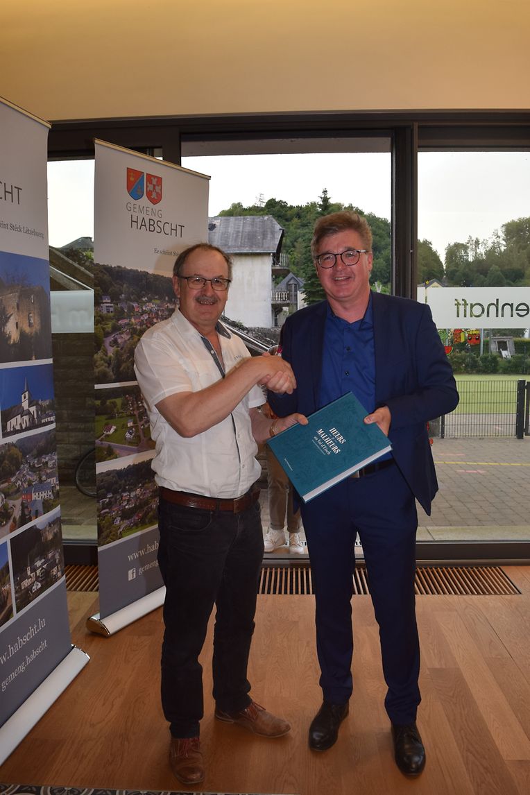 Zum Abschluss der Buchvorstellung überreichte Autor Jean Nehrenhausen ein Exemplar seines Werks an Serge Hoffmann, Bürgermeister der Gemeinde Habscht, die aus den beiden ehemaligen Gemeinden Hobscheid und Simmern entsprungen ist.