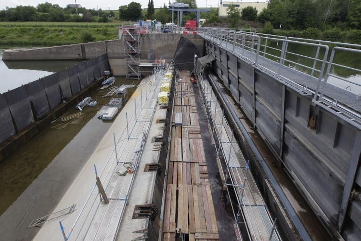 Ein nicht ganz alltägliches Bild bietet sich zurzeit in der Staustufe Stadtbredimus-Palzem. Nicht nur wird ein Wehrsektorkörper erneuert, sondern auch die alljährlichen Wartungsarbeiten stehen an. Der Schiffsverkehr ist in den kommenden sieben Tagen nur eingeschränkt möglich – und zwar auf der ganzen Mosel.