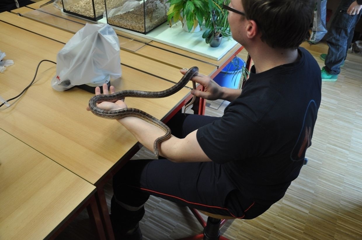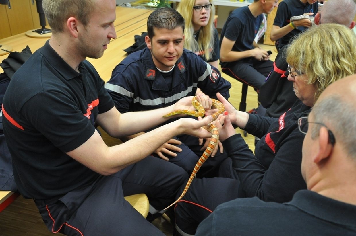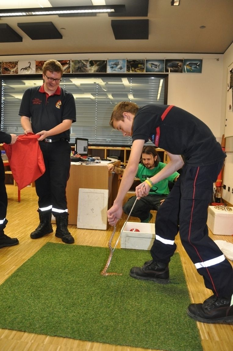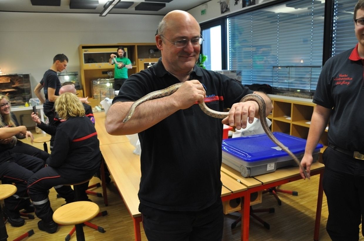 Weydert Gast veranschaulichte mit praktischen Beispielen wie man sich im Einsatz verhalten soll wenn man Schlangen und Spinnen einfangen muss. An verschiedenen Schlangen sowie Vogelspinnen konnte geübt werden und somit die Angst zu den exotischen Reptilien ein wenig gesenkt werden.